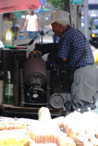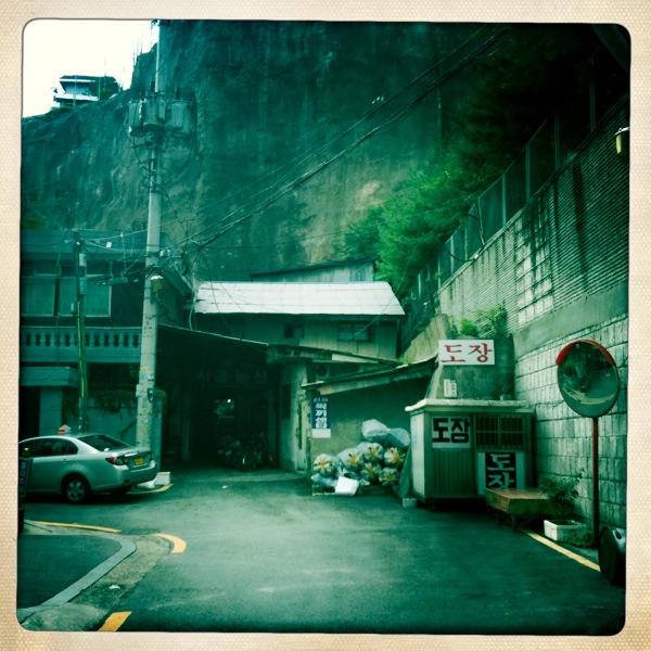 Back on Jibong-gil we passed an old man on the sidewalk who had a machine that air-puffed rice to make bar snacks attached to the back of a motorcycle. Every so often it would emit a loud bang and scare any nearby dogs whose owners had taken them out for a walk.