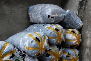 Leaving Exit 1 we turned west down one of the first side streets we came across to get a better look at the cliff face, which at this point was only about a block and a half back from the main drag. At the end of the street a tiny alley under a sign for chili peppers, sesame oil, and wholesale delivery led through some closed-up shops and right up to the base of the cliff. Most of the doors in the rather run-down building were closed up, but because it was Sunday we couldn’t tell if that was just for the day or for good. One door was open, however, and inside were long tables, sewing machines, and bolts of fabric, along with a hula hoop hung up on the wall. At the alley’s entrance was a pyramid of about a dozen trash bags, all filled with clothing scraps. We noticed other trash bags filled with the same thing around the neighborhood, so it’s likely that Changsin-dong is home to a number of small shops that supply Dongdaemun’s huge fashion industry.