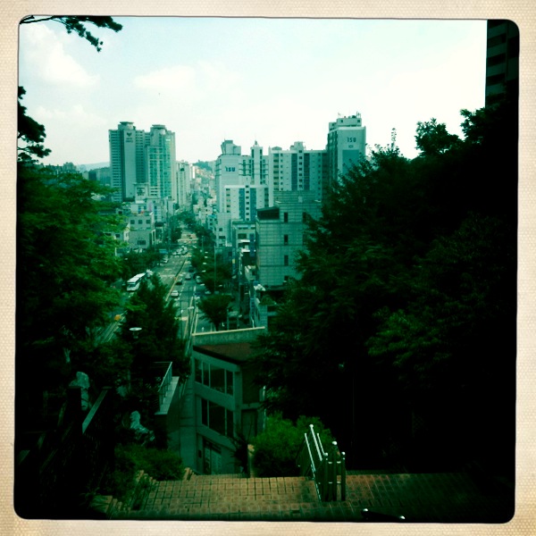 Just a few steps from Exit 2 on the station’s north side, a long staircase leads up the hill above Dongmang-bong Tunnel to a collection of apartments and a church, and the walk up offers great a great view down Jibong-gil to Dongmyo and beyond.