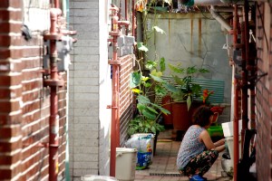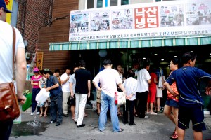 While waiting for the line to diminish we walked through the tiny (And I do mean tiny. At some points I could practically touch both walls just by sticking out my elbows.) alleyways on either side of Jibong-gil. It was a really lovely neighborhood that was completely untouched by the development that had taken place just a block or so away. The alleys wound around between snug old homes and took us past some lovely old wooden doors and more trash bags filled with clothing scraps. Almost all of the faces we saw on the back streets were old ones, and I wondered if they’d lived in the area most of their lives or if development had priced them out of nearby areas where they used to live.