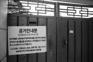 Walking further into the neighborhood opened up lovely views of Bukhansan (북한산) in the distance to the northwest. It was easy to see why this was valuable real estate, and why these homes were going to be torn down so that a developer could build another expensive apartment complex in their place. Looking west across the valley to the other slope I could see that the entire expanse was filled with more empty structures, each bearing the same sign on their front like a white flag, an entire neighborhood of dead homes.