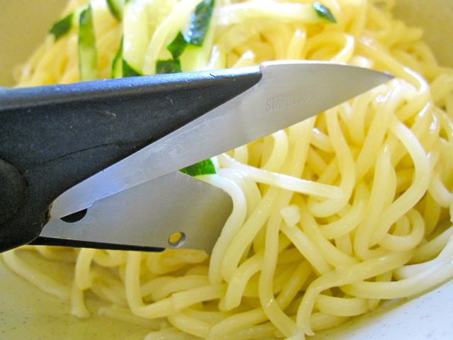 The kitchen shears brought to the table were to snip the very long noodles into manageable segments. The noodles in both dishes were al dente – not overcooked.