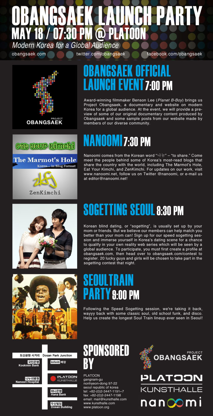 “Project Obangsaek” at 7:30 is having a launch party… the lovely Nanoomi people are making a few presentations about building cultural bridges between expats, non-Koreans, and Koreans…” Read more about the project at fellow Nanoomi partner: http://roboseyo.blogspot.com!