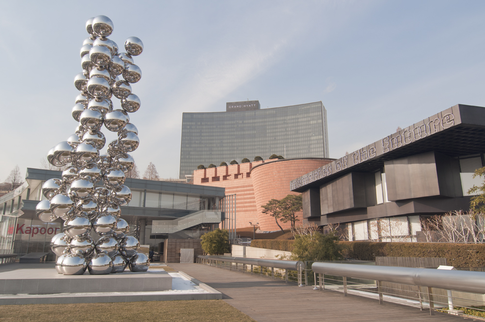 Located just a short walk down Itaewon-ro-55-gil (이태원로55길) near Exit 1, the first thing visitors encounter is the outdoor sculpture garden, which, at the time of my visit featured a trio of pieces by the renowned London-based Indian artist Anish Kapoor, co-designer of the ArcelorMittal Orbit tower that twists above London’s Olympic Village and who was the subject of Leeum’s current Special Exhibition. The first piece I came to was titled ‘Vertigo’ (‘현기증’), a pair of curved stainless steel rectangles. Like your breakfast spoon, their concave side inverted and flipped everything they reflected, messing with the viewer’s perspective and causing a mildly unstable feeling. The structures’ convex sides sat about two meters apart and reflected each other, creating a Russian nesting doll of the same image, each progressively smaller than the last. In addition to ‘Vertigo,’ the garden also held ‘Tall Tree and the Eye’ (‘큰 나무와 눈’), stacked stainless steel orbs like air bubbles rising from the deep, and ‘Sky Mirror’ (‘하늘 거울’), which did exactly as its name implied.