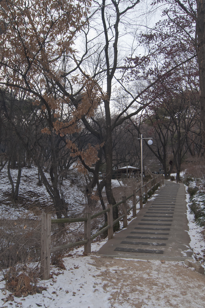 Of course, for an even bigger park, there’s always nearby Namsan Park (남산공원), which is easy to get to from Hangangjin. Just go out Exit 1, U-turn, and follow the sidewalk until it ends. There go up the steps to the left, cross the street, and you’re just outside the park. At that point there was a sign pointing to a mineral spring (남산약수터), only 200 meters away. I followed the sign up the driveway of an adjacent wedding hall, and by the time I made it past the parking lot things had already gotten remarkably calm and quiet, the traffic on Hannam-dae-ro just a faint murmur. The path to the spring then took me past a small artificial stream, its water frozen where the course led over a small drop.