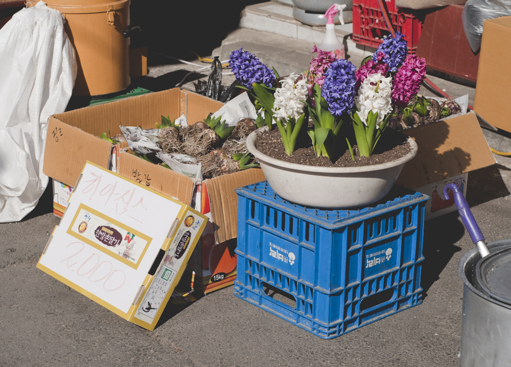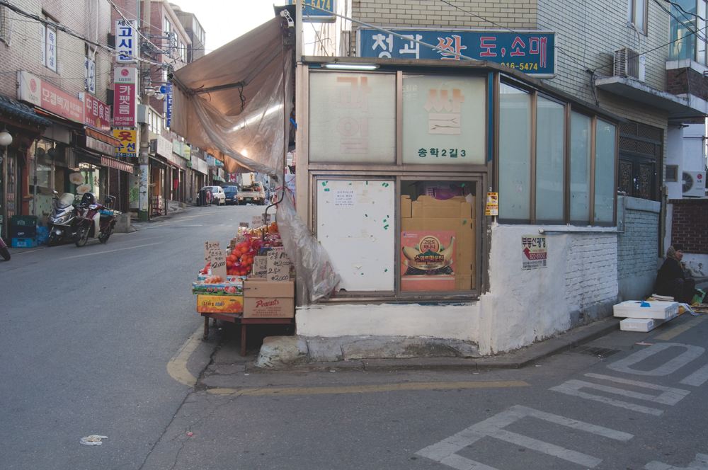 Outside Exit 3 was a cluster of restaurants and bars and a pair of love motels. There was a garbage and recycling yard, and a bit further on I turned left into Sangdo-ro-22-gil (상도로22길), which had caught my eye with its liveliness relative to the streets around it. Running like a vein through the neighborhood, it was lined with fruit stands and fried chicken joints, bunshiks, butchers, fish vendors, and tofu, banchan, and tteok shops. North of Sangdo-ro, Exit 4 led to another garbage yard and a handful of hostess bars on either side of it, all discreetly closed up in the afternoon.