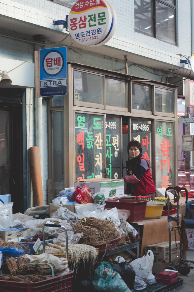 Two markets also occupy the neighborhood. The first I visited, Yeongdo Market (영도시장), was just past a man selling socks from a table set up outside Exit 1 and down the first side street to the right. On the corner with Sangdo-ro were some vegetable sellers, and perhaps a couple dozen meters past them the market building began, with its old red and white 영도시장 sign half-obscured by a banner hanging in front of it.