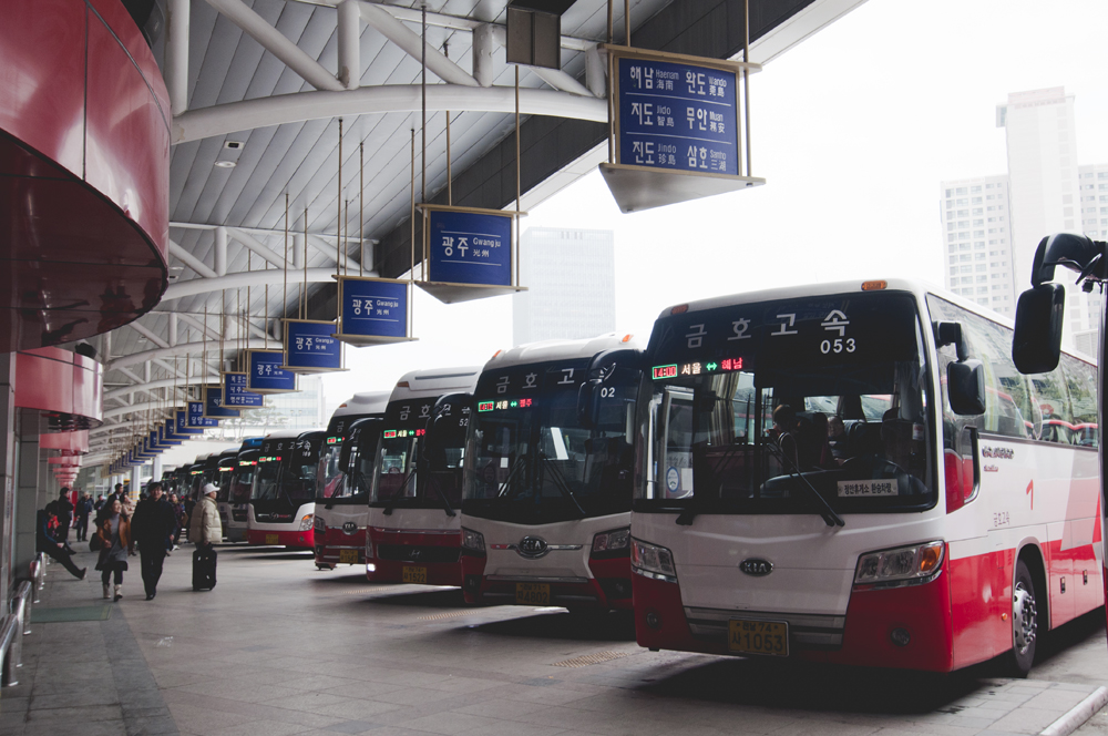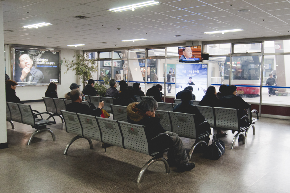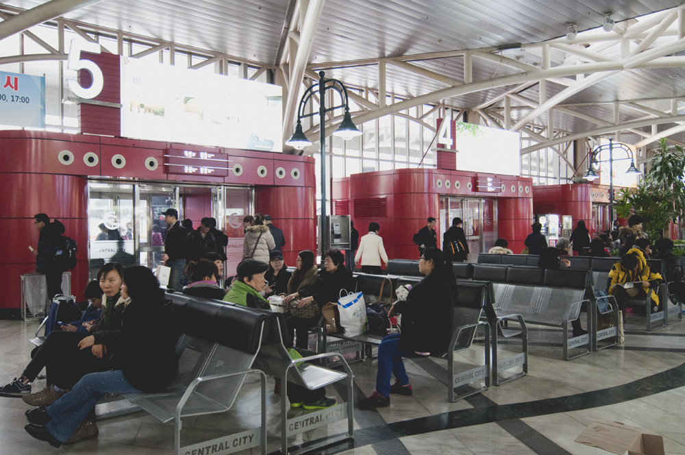 Inside the old terminal was a smattering of people buying tickets, lineups at the ATMs, some travelers wheeling luggage or shouldering bags, others using the coin-operated internet stalls, sailors and soldiers on break, plenty of folks getting quick pre-trip meals or buying snacks, and the less-comfortably dressed on their way to the fifth floor wedding hall. A few regional tourism signs were up, including one for the east coast province that read ‘Gangwondo, always on my mind.’ Buses were headed to Cheongju, Daejeon, and as far as Busan.