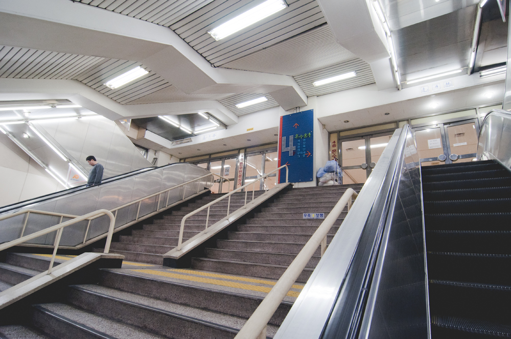 It always takes me a while to get my bearings when I arrive at Express Bus Terminal Station, whether I’m there to catch a ride out of town or on my way to somewhere in the neighborhood. Three lines merge here, one bus terminal is two terminals, there’s a department store, two shopping malls, maybe more, and jammed in between all that are shoe shops, makeup boutiques, salons, and even a sauna. I could live here. A couple times I’ve been so turned around that I thought I might have to.