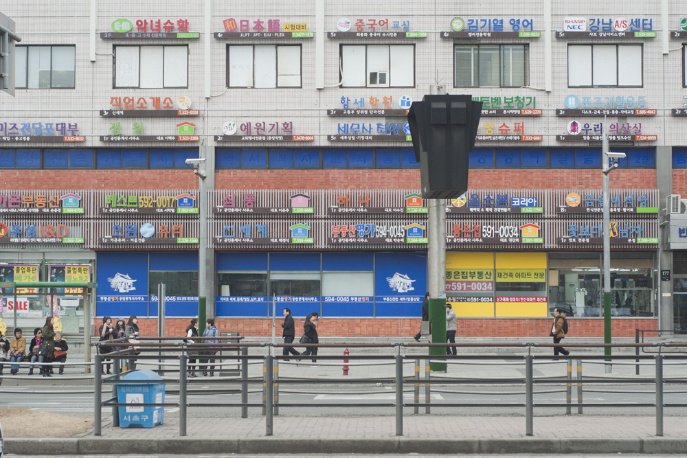 On the street above, the side of Sinbanpo-ro opposite the terminal is fronted by five-story buildings filled with shops, real estate offices, and hagwons. A disproportionate amount of the retail space is taken up by a variety of Christian shops. There were religious bookstores, places selling wooden crosses and Christian CDs, a shop called the Korea Protestant Department Store, and one store with choir robes displayed in its window.