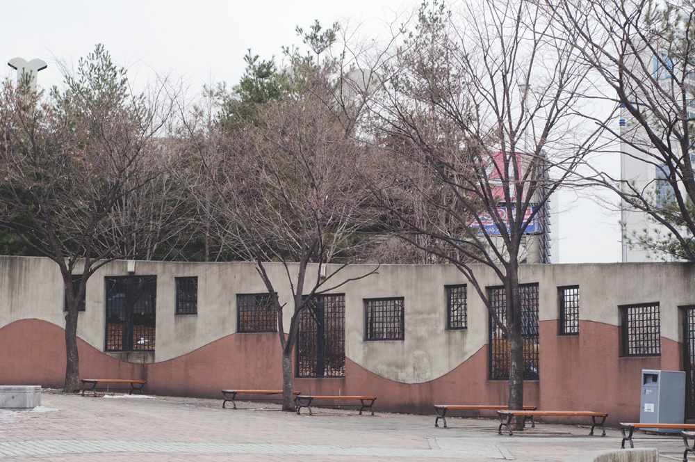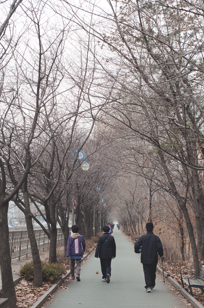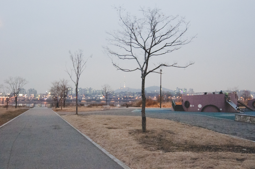 The park was predictably empty in mid-February, the grass still two-thirds covered in snow, though a handful of expats were out playing football, two bikers were taking a break under a canopied rest area, a man on a thick-wheeled unicycle rolled by, and a woman walked a pair of bichon fries that were both spotless white from their haunches up and coated a muddy brown below that. In warm months, however, this is one of the most popular stretches of the park, in part because of the Banpo Bridge Moonlight Rainbow Fountain (달빛무지개 분수), which is recognized by Guinness as the world’s longest bridge fountain, though just how deep that field is is not something I’ve ever heard the Korea Tourism Organization mention in the same breath. Competition (or lack thereof) aside, the fountain is pretty impressive, with nearly 400 nozzles and 200 lights and it’s certainly a nice backdrop to an evening picnic or date, though I’m personally of the opinion that if you’ve seen it once, well, you’ve seen it.