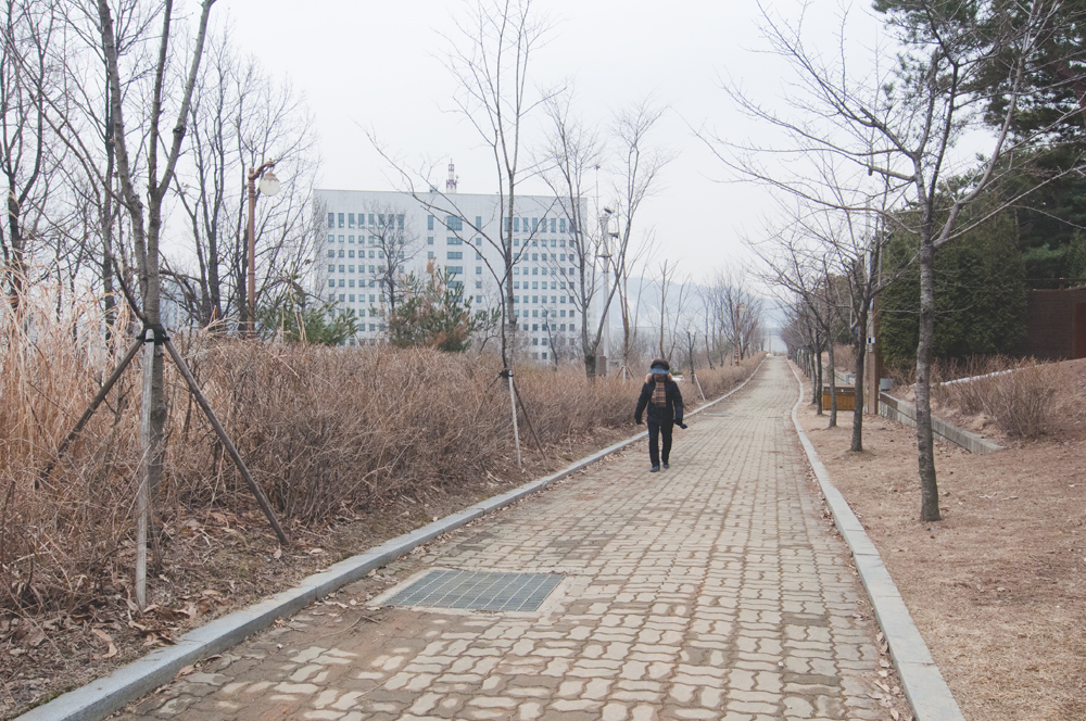 Just past the library you’ll notice the pedestrian Silkworm Bridge (누에다리) crossing high above Banpo-ro. Ten white rings provide the frame for white wiring, resulting in a structure that resembles the animal so closely associated with this part of Seoul. Climb up the steps leading up to the bridge and you’ll find yourself in Montmartre Park (몽마르뜨 공원), a pleasant hilltop park that offers unexpectedly fine views off to the southeast and southwest. Near the entrance was a spot that I believe is actually used as a reference point for GPS systems and making maps. Square stones around it signaled the directions of and distances to several cities around the world, including Washington D.C., Pyongyang, Singapore and Berlin. A number of people were walking their dogs around the path running along the hilltop, and four built or partially-built snowmen still dotted the field in its center.