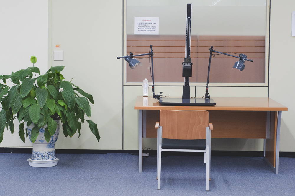 If you pass the park and continue south along Banpo-ro, passing Catholic University (가톨릭대학교), you’ll eventually arrive at the National Library of Korea (국립중앙도서관). The first thing you’ll see is the black glass façade of the relatively new National Digital Library of Korea, or Dibrary, which opened in 2009. Inside, I was greeted by a little garden of digital screens displaying changing images of flowers. A section of the wall behind them had white on black Chinese and Hangeul characters in glass, which served as a stark contrast with all the high tech gadgetry around them. There were of course computers and laptop stations, but also kiosks where visitors could browse newspapers and a few magazines on touchscreens. Upstairs was a huge spread of computer stations, both desktop and laptop, along with meeting rooms; multiplexes where groups could watch videos; a Digital Editing Zone for video and image editing; and video and audio studios for producing and recording. I hadn’t been to a library in a long time, and the near-perfect silence was startling, especially in a tech-oriented space in a city as buzzing as Seoul.