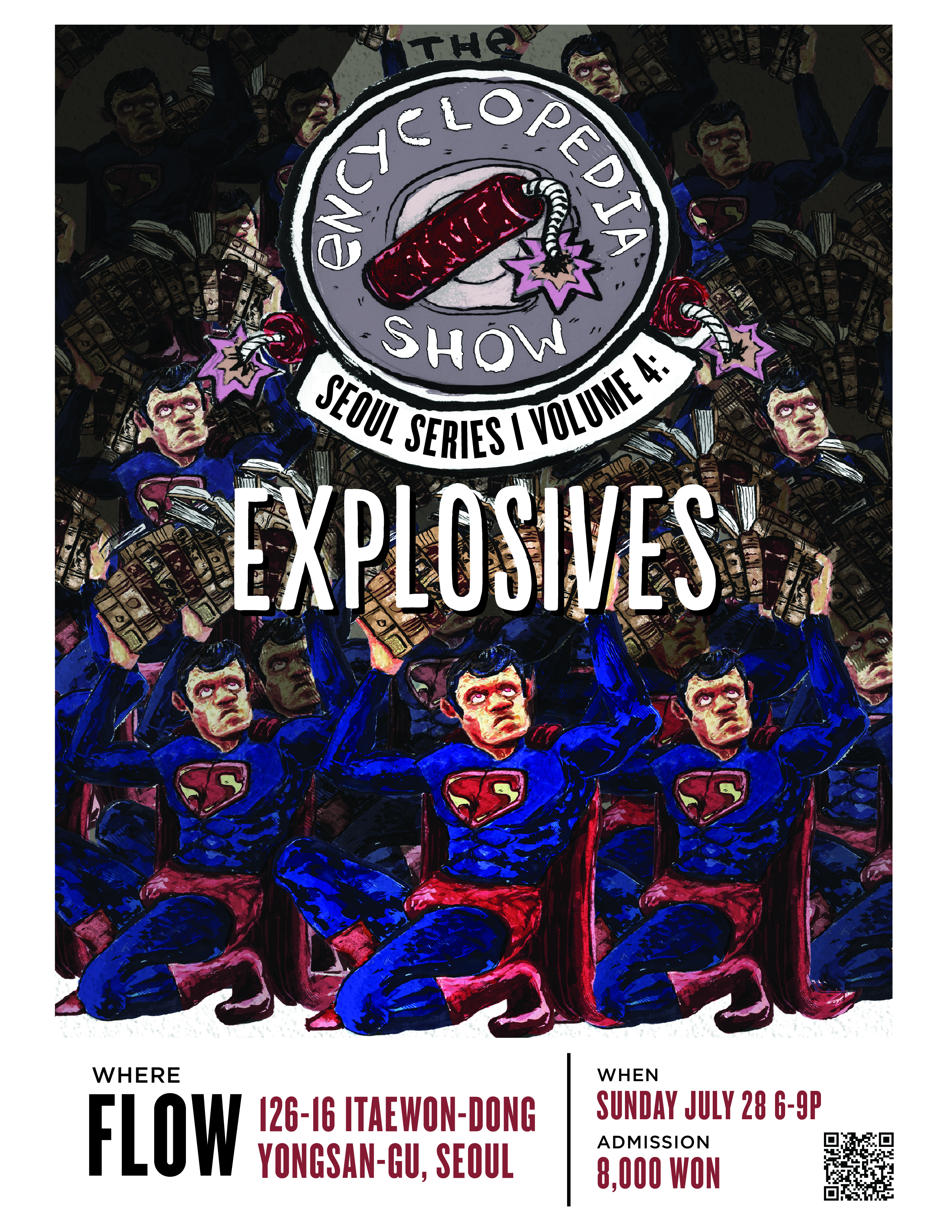 To illustrate some of these interesting constraints, past show themes have included Gravity, Bears, The Periodic Table of Elements and most recently, The Visual Spectrum of Color. For the fourth volume of The Encyclopedia Show-Seoul, some of the best wordsmiths and visual artists in Seoul will be expected to blow people away by drawing from the topic of all things Crash! Boom! and Kerblwey!!!!! (i.e. Explosives). The night’s program will showcase some of the best talent in Seoul, including poets Tony Dennis, Lebogang Mogashoa, Elliot Ashby and Susan Morgan performing pieces on subjects ranging from The Manhattan Project to Wile E. Coyote. Specially designed comic books on Alfred Nobel created by 13 talented local and international contributors will also be available for purchase. The Encyclopedia Show-Seoul Series 1 Volume 4: Explosives is scheduled to be held on Sunday, July, 28 6-9 p.m. at Flow, in Itaewon. The cover charge is 8,000 won with the proceeds going to the Landmine Relief Fund.