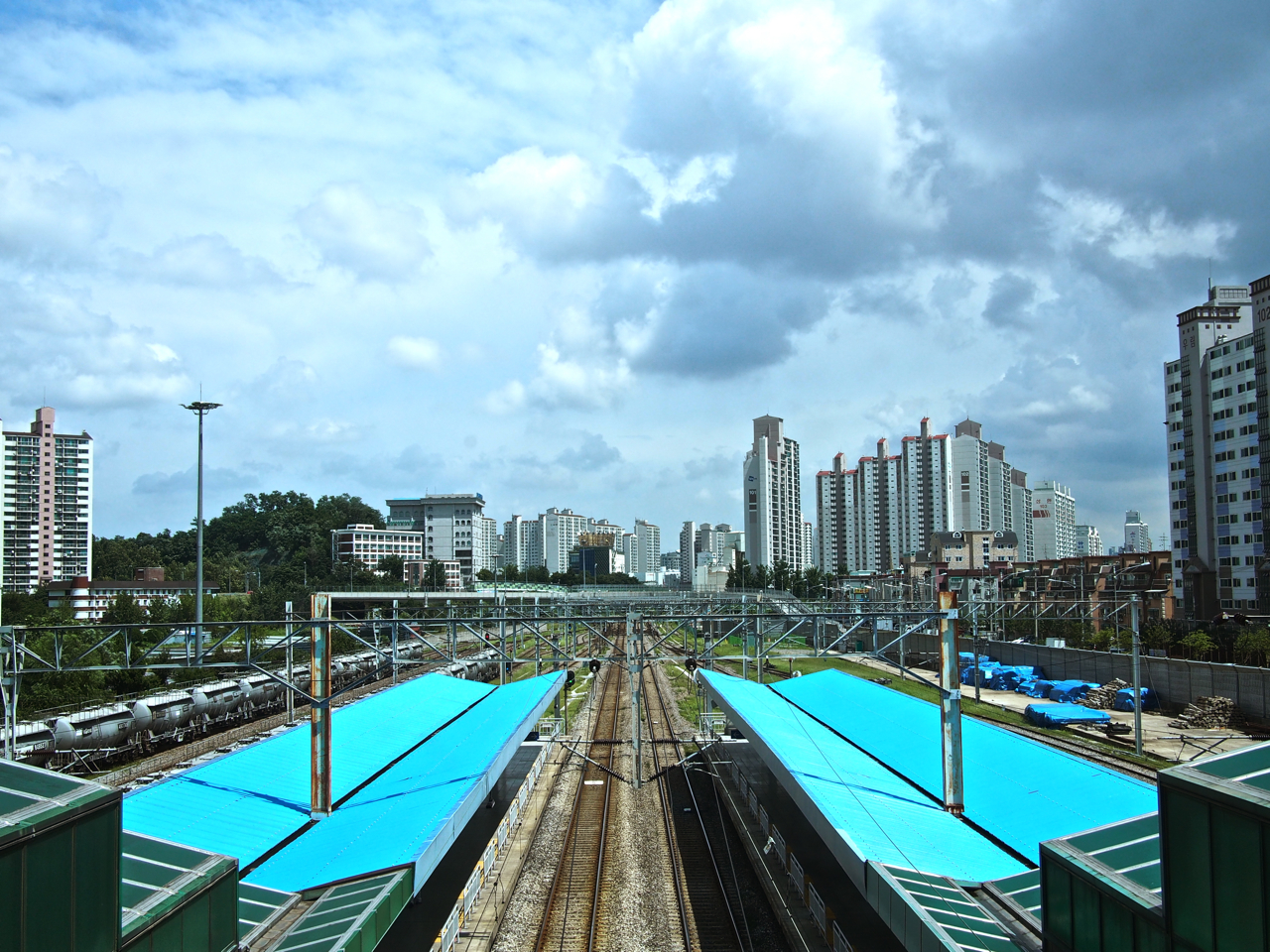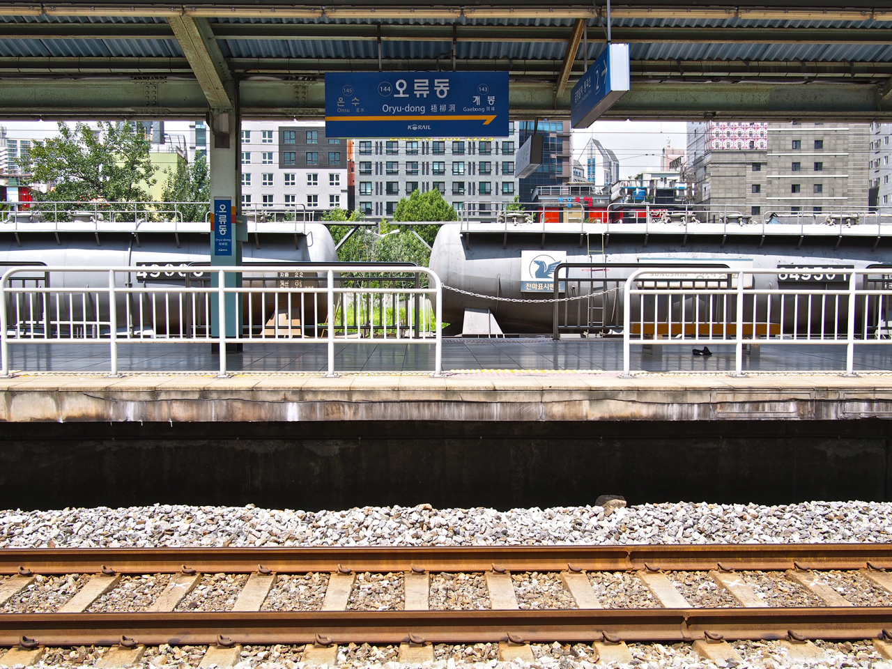 From almost anywhere in town it’s a long ride to Oryu. The train leaves its urban tunnel, and by the time you’ve passed Sindorim many of the passengers left seem headed back to Bucheon or Incheon after forays into the capital. The station itself has the open feel of a provincial depot, with platforms that feel broader for being in the sunlight and rusted rail ties piled up in the spare space alongside the nearly dozen tracks.