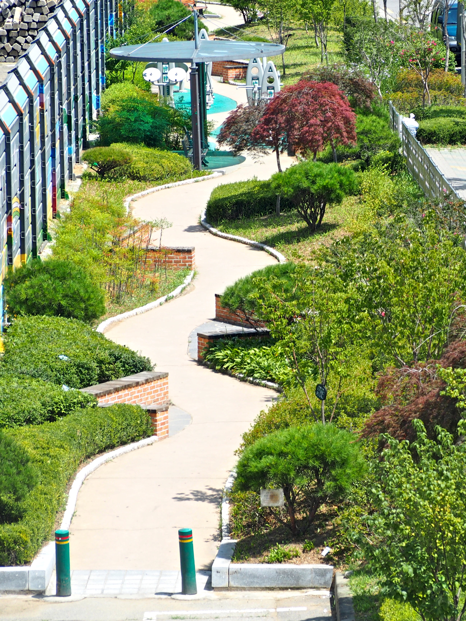 Out of Exit 1, there was a little meandering walking path squeezed between Seohaean-ro (서해안로) and the tracks, replete with benches and some greenery. Butterflies flitted from flower to flower. The strip was separated from the rails by a metal fence that had been painted with trees and flowers; on it hung paintings by local art hagwon students that were now cracked and faded from long exposure to the sun.