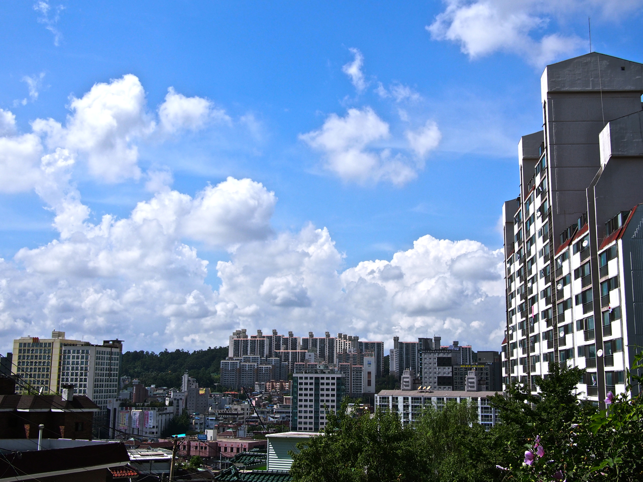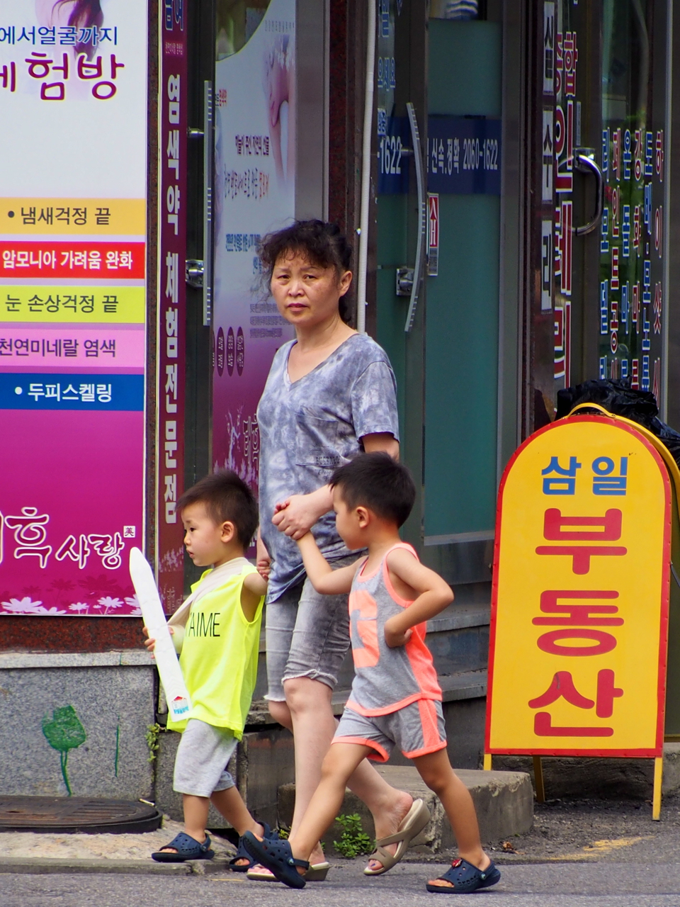 The neighborhood to the south held brick or stone apartments and homes, many of them with small trees or shrubs growing in the narrow space between the buildings and the brick walls along the street. Numerous other homes had potted plants on the steps up to their doors. What businesses were around were small and independent, and there was a peaceful hush in the streets. It didn’t feel like my day to day Seoul. Another sure sign that I was all but out of the city: rolling through the backstreets was a truck indiscriminately spraying its white trail of insecticide, futilely attempting to rid the neighborhood of its mosquitos.