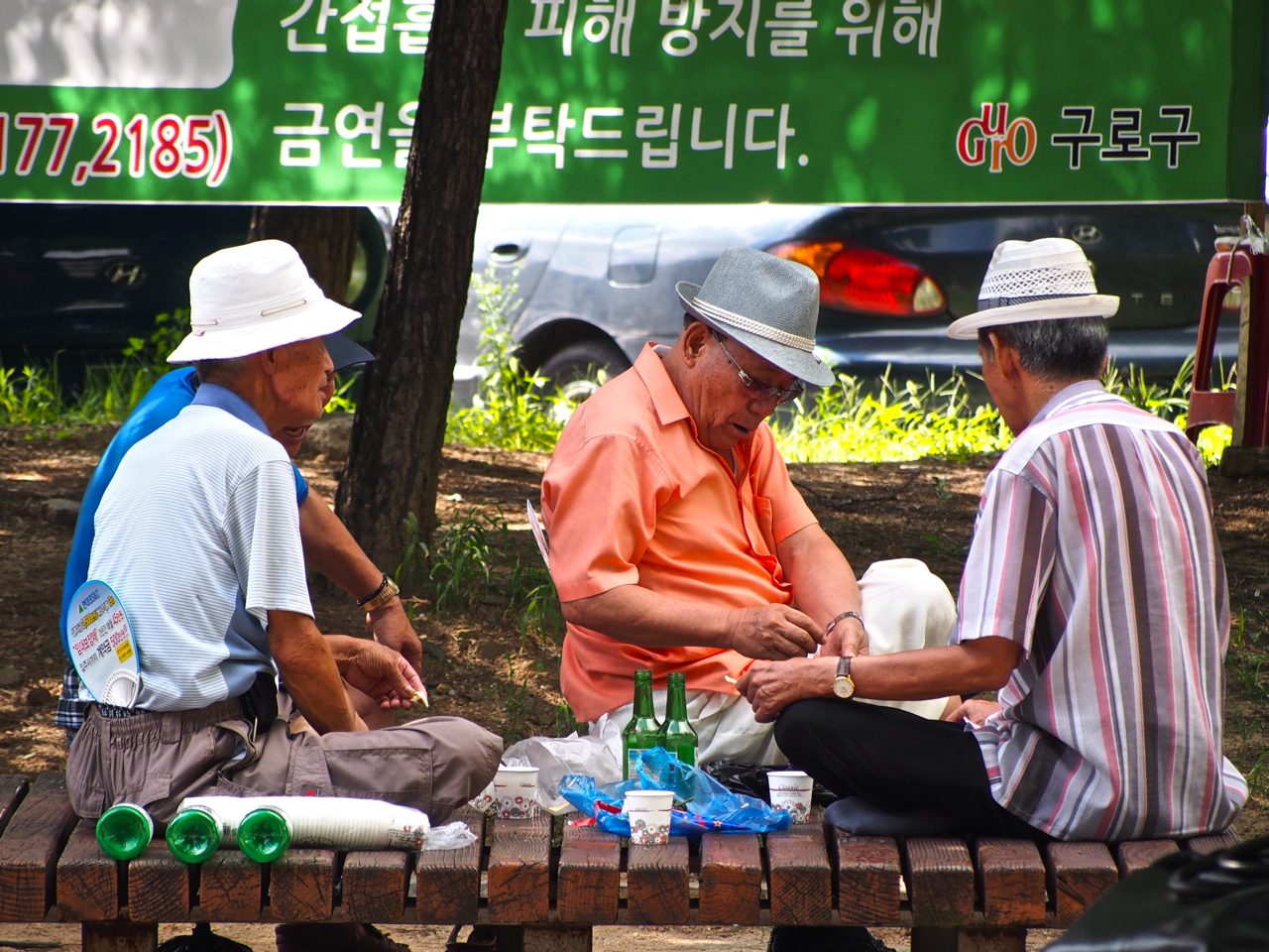 Oryu-dong’s north side was a lot busier than its south side, with newer buildings, more chain stores, and more noise. Exit 3 came out on a plaza, where a butcher and a flower shop stood just across from the escalators. There was a bronze statue of dancing figures, a net-less basketball hoop, and groups of old folks gabbing on shaded benches.