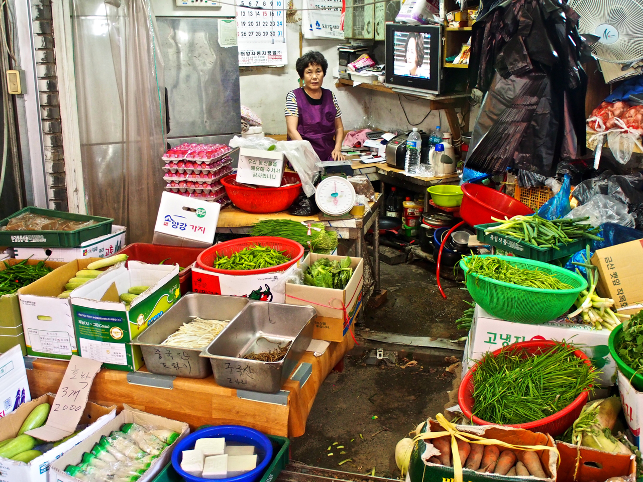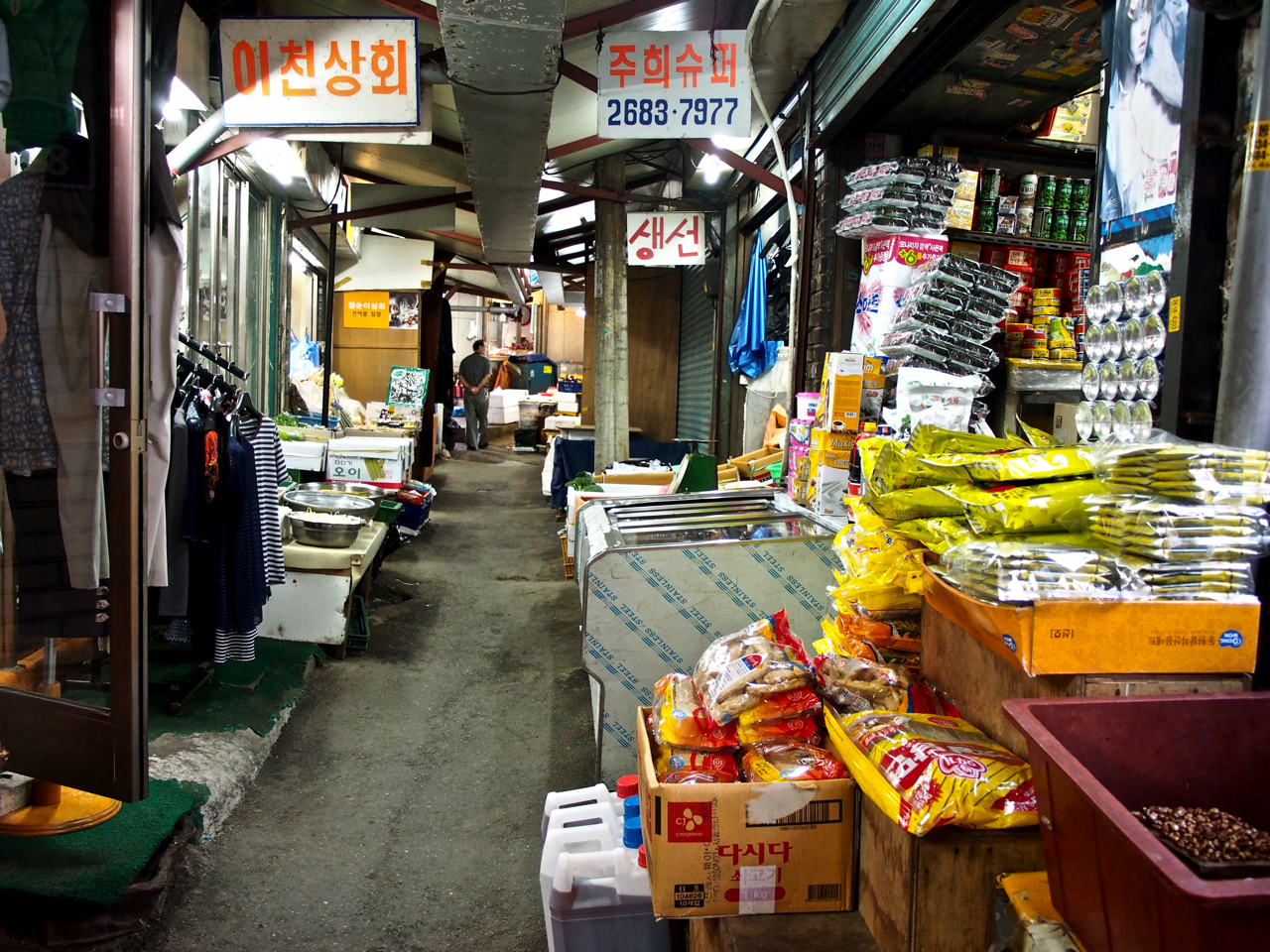 Turning to the left on Gyeongin-ro and then right on Gyeongin-ro-19-gil (경인로19길) put me at one of the entrances to the decaying Oryu Market (오류시장). Wedged into twisting back alleys, the market was covered by a corrugated metal roof supported by rusty crossbeams, below which buckets were placed here and there to gather water from leaks. The place felt claustrophobic. Shops in the market were small, housed in cramped, low-ceilinged stalls, and the aisles between them were often only wide enough for two people, touching shoulders, to walk down at a time. Wires with dangling plugs wound around pipes overhead, the electricity running through them lighting up occasional bare bulbs. The concrete floor was chipped and cracked, nearly all shop signs were handmade, and on every surface paint was peeling. The smells of fish and sesame oil hung in the air.