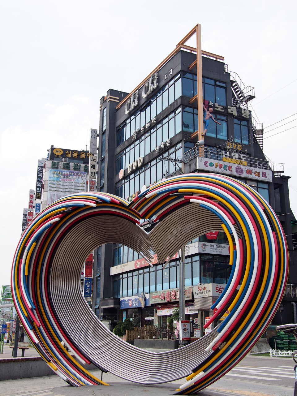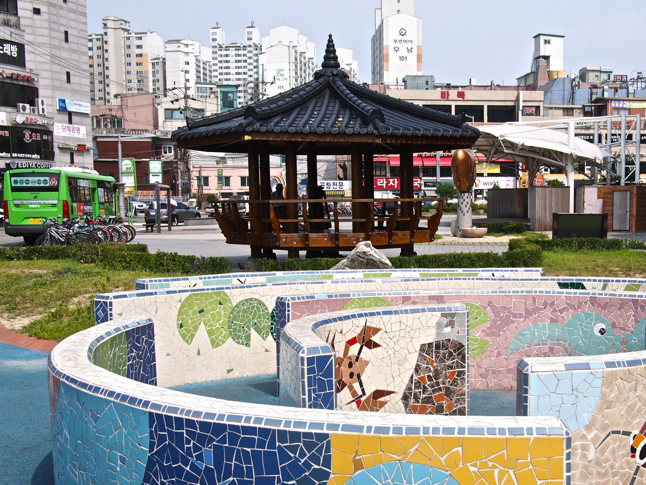 The Culture Park doglegged to the left, and at the bend there was a colorful heart sculpture, beyond which the park also held an outdoor stage and a pavilion. Past those was a grouping of concentric circle sections that were covered in tile mosaics. This was described on the park map as being a ‘maze,’ but there wasn’t any start or finish and anyone not tall enough to see over the walls probably couldn’t walk either, so as a maze it was quite ineffective, but at least its undersea-themed murals were cute. After the maze, the last thing in the park was a drum wall, which was exactly that: a wall with several built-in plastic drums that kids could hit. Fortunately there weren’t any doing so when I passed by.