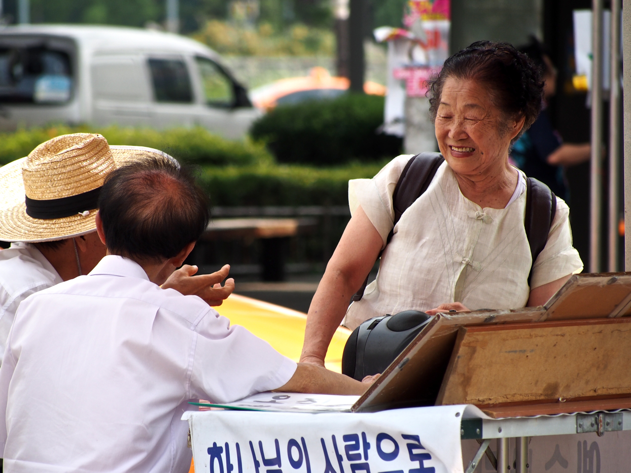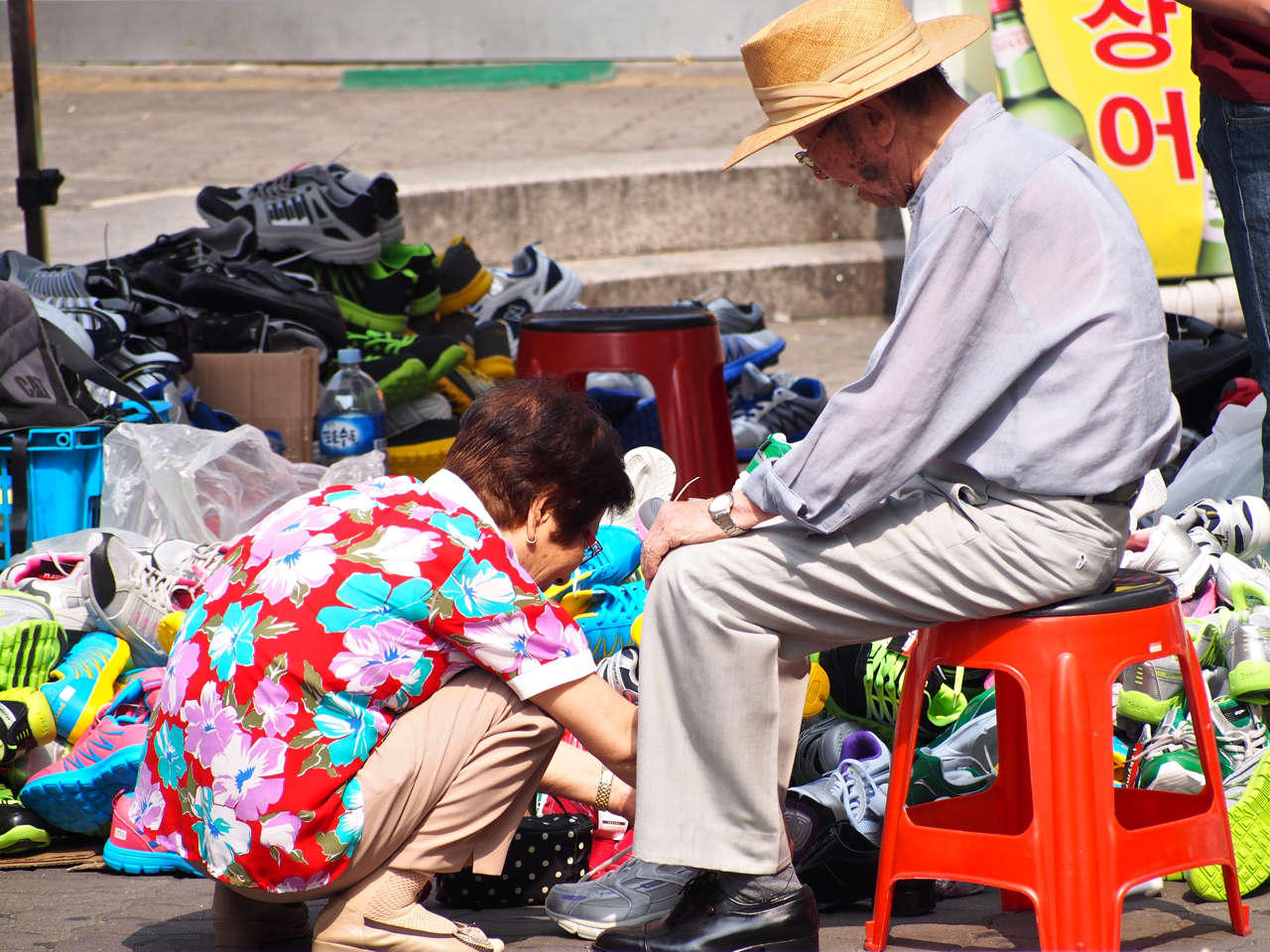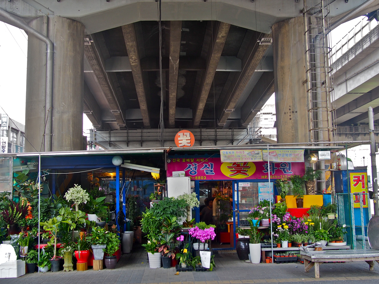 A smaller road running by the apartments off to the right was blocked from the road I was currently on by a row of trees and a gulley, but eventually I found an improvised slash of dirt and stones through the trees and I scurried down. I headed back in the general direction of the station, which took me past a garden and a small apartment block market where local ajummas sold produce and legumes to other local ajummas.