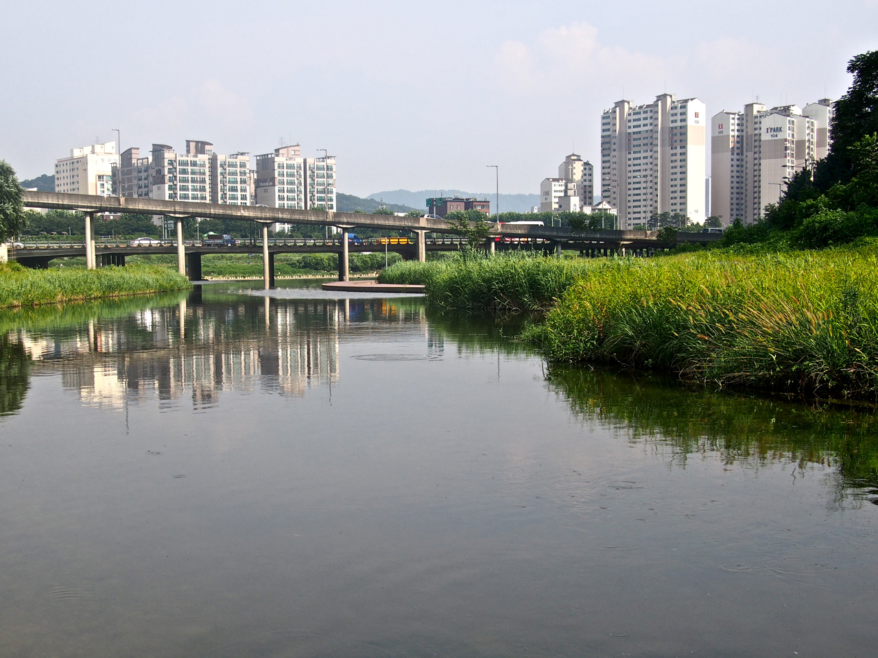 The Woo-i Stream, which I’d been tracing upstream from its mouth a short time earlier, disappears under the pavement around the station, only to reappear just west of the park, albeit in a much more homely guise. Whereas near the Jungnang it was placid and inviting, here it was simply a grim urban watercourse flowing between concrete walls, making me hope that this upstream section soon got the same refurbishment that its final stretch had received.