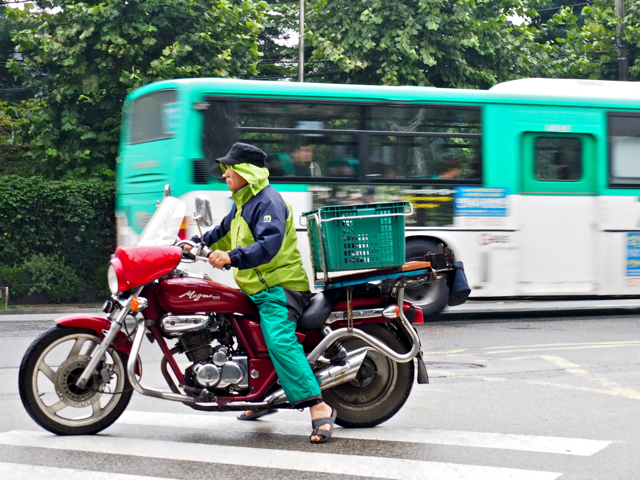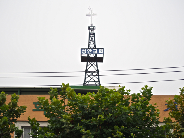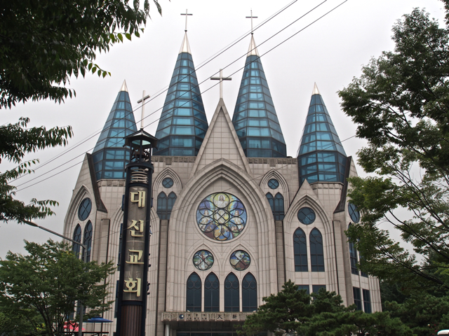 Between the pitch and the road was a machine shop, and after I followed the street past some wild daisies, their petals hanging limp from the rain, I turned right on Gyeongin-ro (경인로) and came to some other businesses of the same type.  There were other stores along the road and apartments behind them, but virtually no other pedestrians on the sidewalk, unsurprising as there wasn’t much of anywhere to walk to.  I was in the car zone.  I was in the burbs.  Nearly all of the buses running past me were the mint and white ones linking Seoul to its satellite towns, and just in front of a technical high school I went under the broken Gate of Reliance/Dependence/Trust (신뢰의문) (Depending on which translation from my electronic dictionary you want to go with.  I’ll go with that last one.), and before I knew it I was out of Seoul and in Bucheon, so I turned around and walked back to the station, making note on the way of what seemed like an unusually large number of small churches in the area.  I passed a couple nuns too, and outside Exit 3 a man was handing out religious pamphlets, though there weren’t many people coming or going to take them.  I also spotted what I’m pretty sure were the offices of a religious newspaper, titled the 내외일보, which, firing up the old dictionary again, could mean either the Interior and Exterior Daily or the Avoidance of the Opposite Sex Daily.