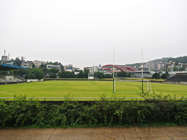 I’d stepped out Exit 1 because the station map indicated that an even more unusual creature could be found there.  Outside, the only direction I could go, however, was across a small paved lot that led directly to Exit 2, twenty meters away, and I wondered what the point of the first exit was.  Maybe the boshintang restaurateur was friendly with the station’s engineer.  From the second exit I went left on Gyeongin-ro-3-gil (경인로3길), and a few meters up the street there it was, the Seoul Rugby Stadium (서울럭비구장), an actual rugby pitch with scoreboards and stands and goalposts and everything.  It was even natural grass and not the synthetic turf of green plastic and tiny rubber pellets that usually make up the playing surface of any athletic field below the professional level in Korea.  The only blemish was a circular patch of dirt in the middle where the grass had worn away.  I didn’t know how much rugby the pitch actually saw, though, as soccer nets had been set up in front of the goalposts, at least temporarily.