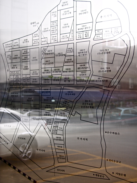 Beyond the construction site was a grouping of large gray and ivory buildings with small windows and blue roofs.  That was the complex and I turned back towards Buil-ro to try to find a way over there.  I turned onto Buil-ro-1-ga-gil (부일로1가길) and followed it a short ways until there was a sign over the road pointing to ‘Onsu Indus. Complex (서울온수산업단지)’.  At the corner there was also a large street map of the complex’s layout and, overhead, a banner reading ‘기업의 성장! 나라의 발전!’ (‘Enterprise’s growth!  The country’s development!).