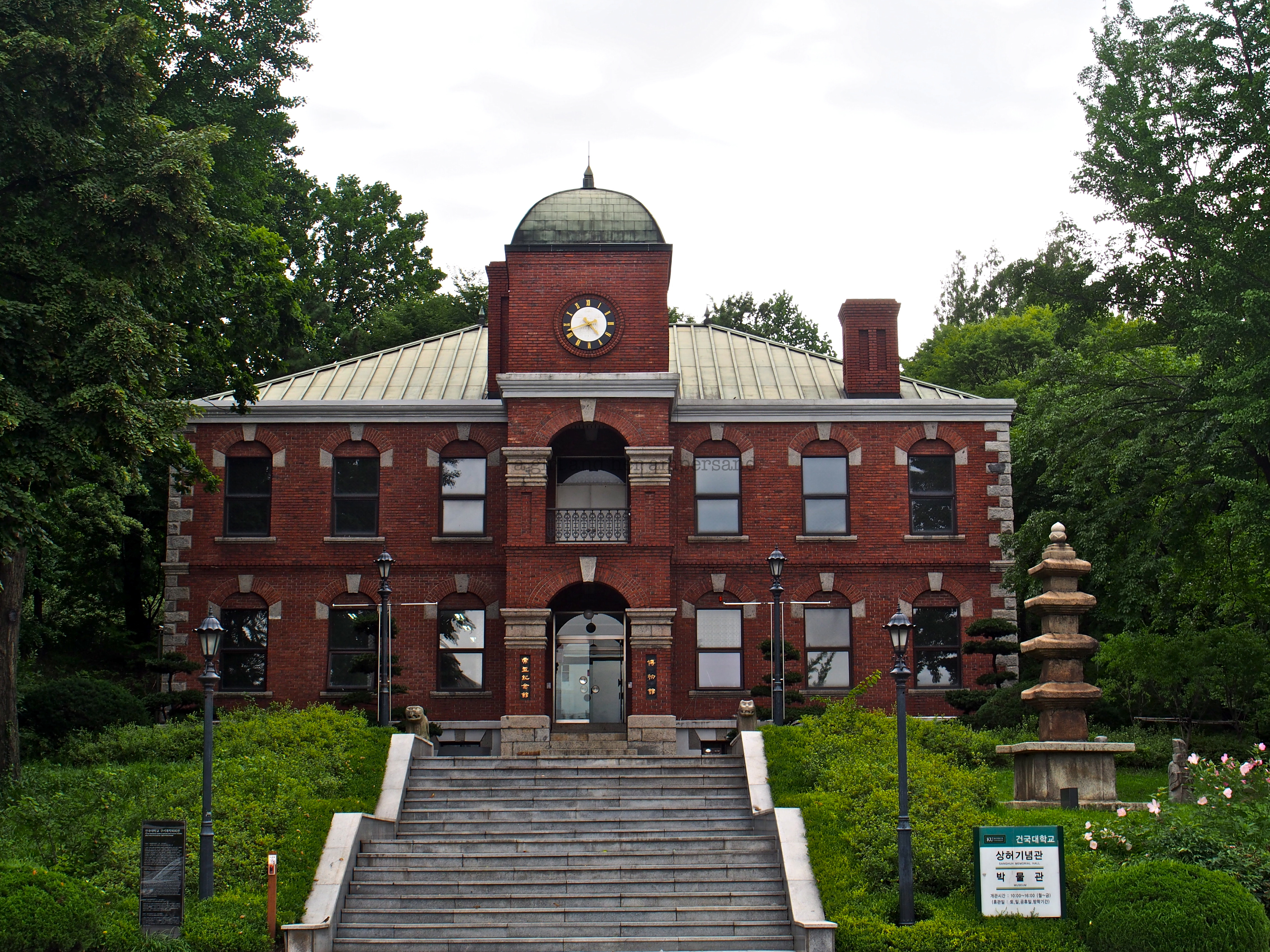 Finally I came to the Former Seobukhak Academy Assembly Hall in Konkuk University (건국대학교 구서북학회회관) near the lake’s northwest edge. Red brick with large gray corner stones and a clock tower dome, it was originally built in 1908 in Nagwon-dong in Jongno to be the assembly hall for Seobukhak Academy, a patriotic organization for cultural enlightenment. According to the onsite plaque, Yoo came to be the owner of the building in 1939 and after independence it was there that Kondae was founded. The university moved to its new campus in 1956; twenty-one years later the assembly hall was disassembled, then reassembled in its current location in 1985. Today it’s recognized as Registered Cultural Property No. 53.