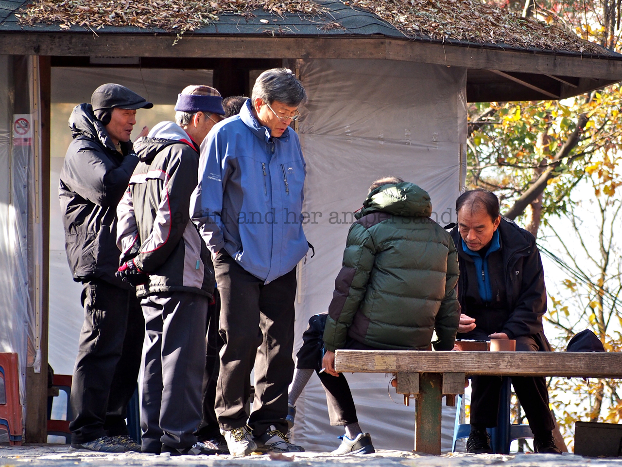 Perhaps it was because I showed up over the Chuseok holiday period, but there were a lot more people on the mountain than I expected, and their numbers only grew the further up I went. Perhaps fifty or a hundred meters from the peak there was a large collection of exercise equipment, far more serious than what you typically see in Seoul parks, including around a dozen sets of free weights. Most of the equipment was rusted to some extent or another, but it was finding plenty of use. There were maybe thirty people there working out or acting at working out, mostly guys over 50, and the place brought to mind a Korean retirement home version of Muscle Beach. One guy was doing curls in front of a mirror that leaned up against a tree, another, dressed in slacks and a polo, shadow boxed, and someone else was doing ‘bench presses,’ taking the bar down maybe ten centimeters, and that’s being generous.