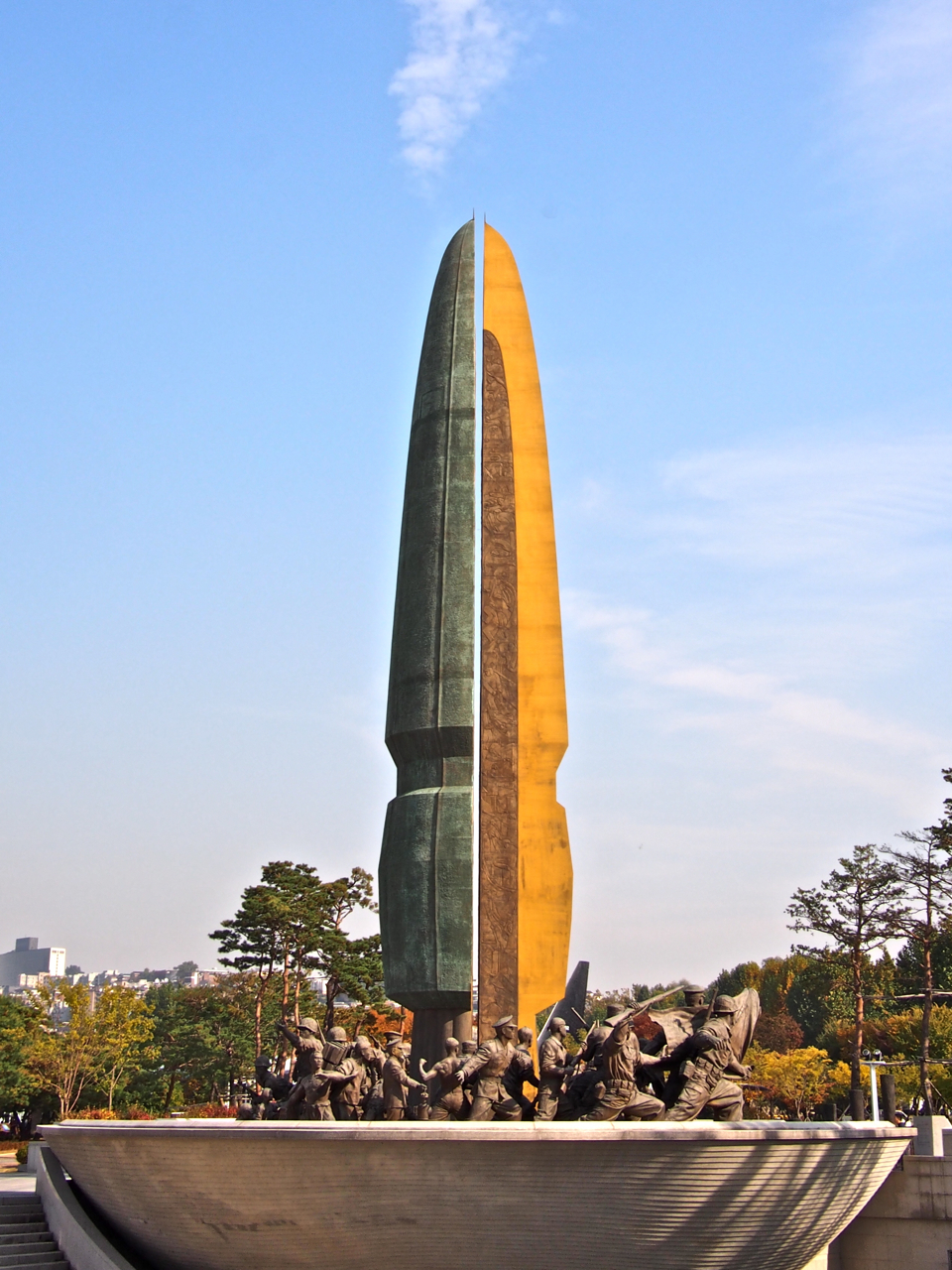 Except for this thin strip along Hangang-dae-ro virtually all of the real estate northeast of the station is taken up by the enormous War Memorial of Korea (전쟁기념관), just steps from Exit 12. There are a few smaller entrances, but if you go into the grounds via the main entrance you’ll pass the prominent Korean War Monument (6.25 전쟁조형물), a tall gold, bronze and green tower flanked by two semi-circular sculptures of 38 people representing the citizens of South Korea in the war. Most of these are soldiers in various straight-backed, heroic poses that wouldn’t look out of place on the other side of the border, or civilians defiantly raising flags and lanterns, but in a refreshing bit of honesty this mythmaking is tempered by other figures who have fallen and are left to cry out for help.