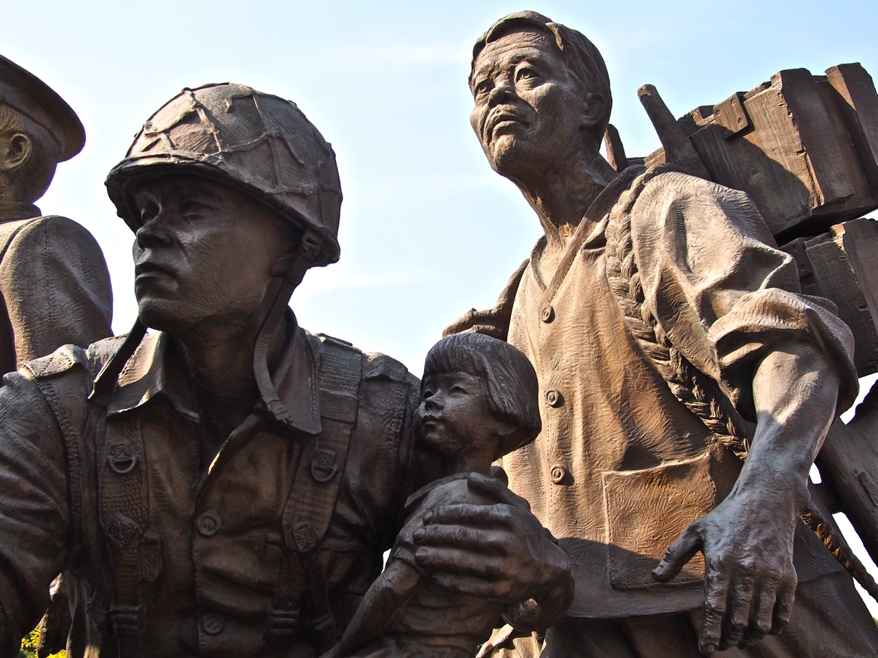 West of the monument, near the west gate, is the Statue of Brothers (형제의 상) where two soldiers stand atop a stone slab dome, one supporting the other, who is slumped up against the former’s torso, exhausted or dying. I didn’t spot any information about the statue on site, but the brochure available inside the museum claims that it depicts a real-life story about siblings who fought the war on opposing sides and reunited by chance on the battlefield. Inside the supporting dome are a couple of mosaics and plaques in the floor, again acknowledging the South’s nations-in-arms, each plaque listing the battalions they contributed as well as their dates of engagement.