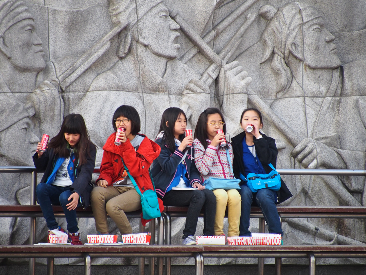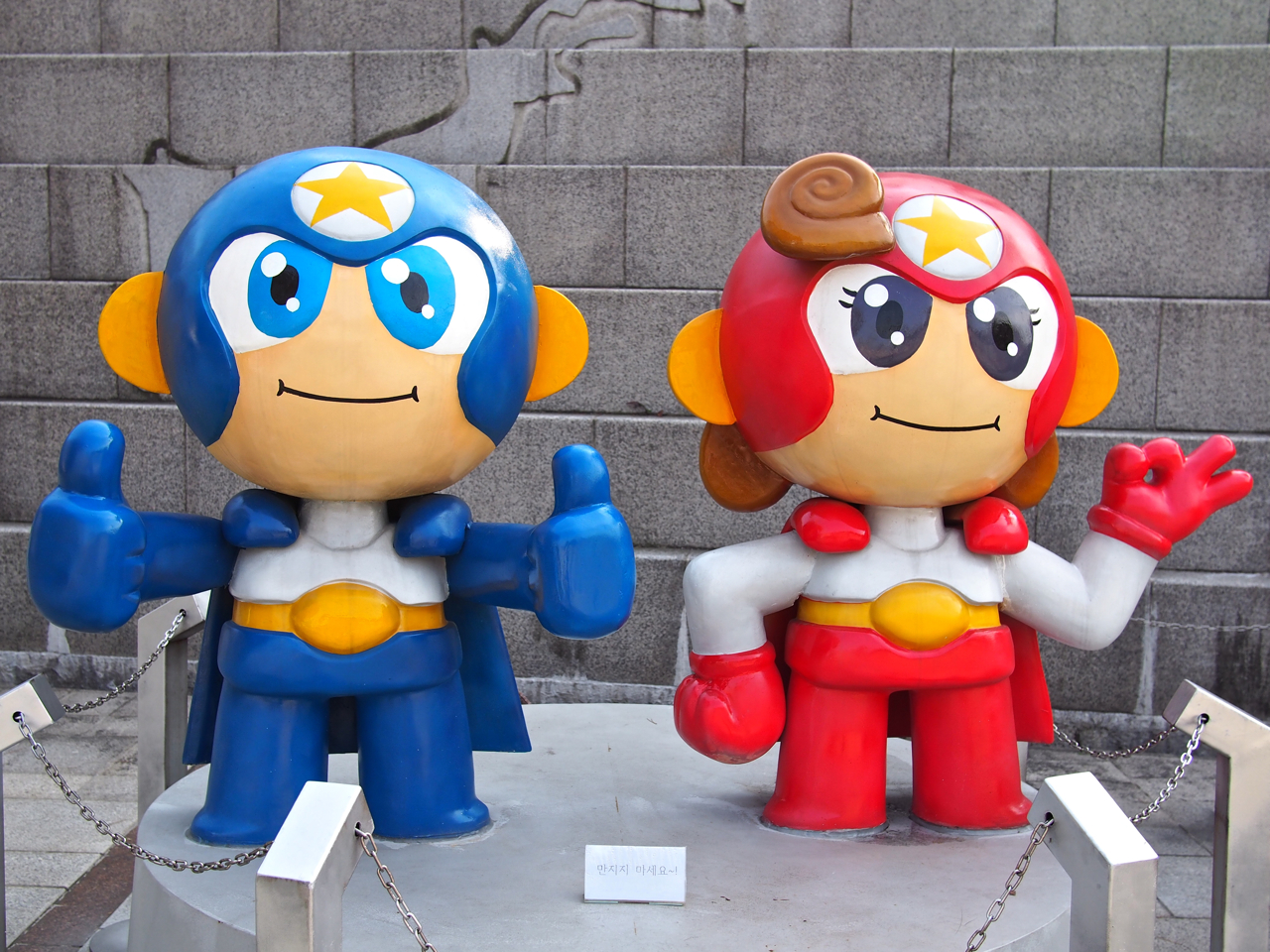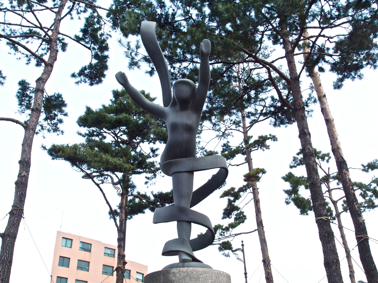 A second tribute to the song can be found between Exits 12 and 14 on a traffic island in the midst of the Samgakji intersection. The song’s lyrics are carved into a stone slab, above which is an utterly bizarre statue of a stylized figure standing on one foot, arms raised, a ribbon wrapped around them as if they were a rhythmic gymnast. There was no connection between the statue and the song as far as I could tell, and it seemed as though whoever erected the structure just went with whatever was the first statue they could get their hands on.
