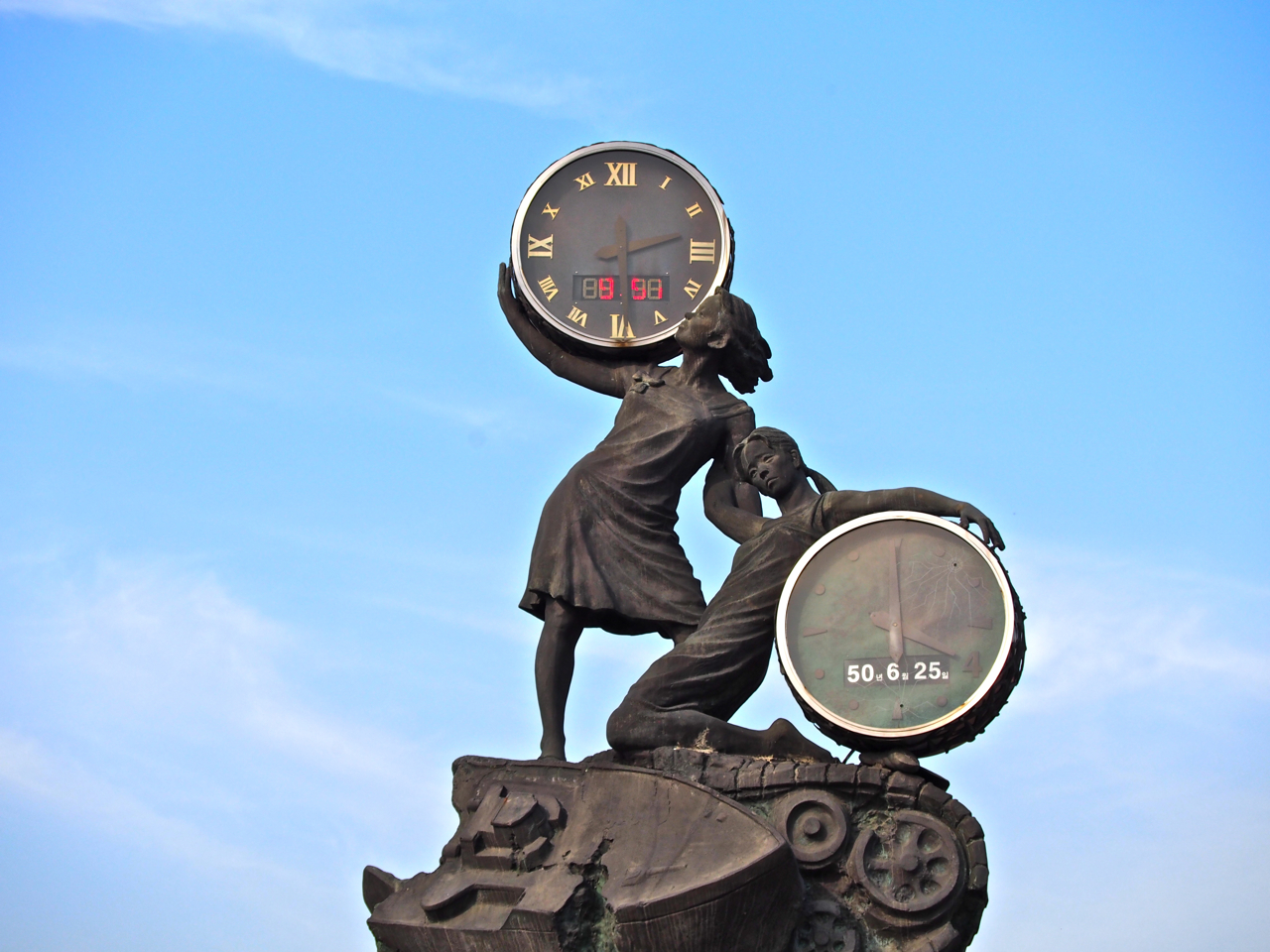 A few steps from the Statue of Brothers is the Peace Clock Tower, which the same brochure helpfully explains is ‘the only clock tower in the world that symbolizes the Korean people’s sincere hope for unification and peace in the form of two girls,’ which puts it nearly on par with a clock that I own, which is the only rectangular analogue clock in the world that is made out of red paper and is used to record the amount of time that Charlie Usher’s pasta needs to be boiled. I give tours. $50. By appointment only.