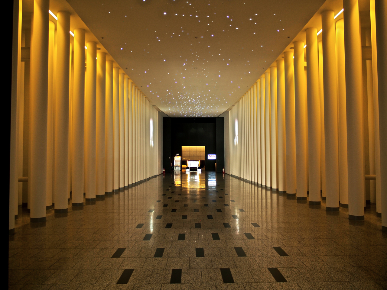 At the end of the Stars of National Defense hall is a room called Creation where a ray of sunlight shines down on a large black hemisphere that pours water over its edges into a circular pond. Super Zen.