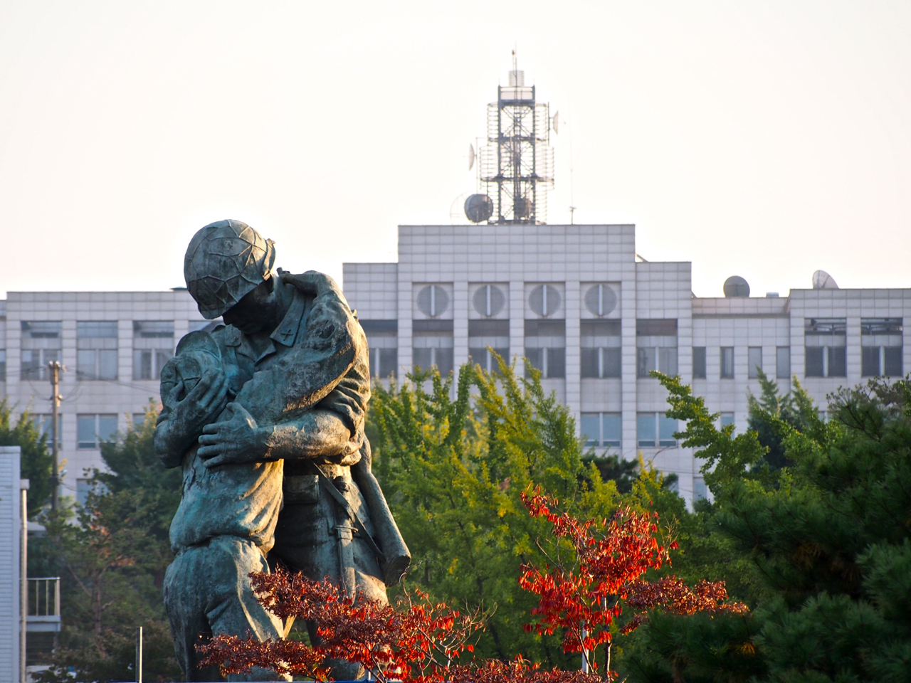 Opposite the War Memorial and just a short walk from Exit 13, past the Seoul Regional Office of Patriots and Veterans Affairs and a signboard for BMW Military Sales, is Korea’s Ministry of National Defense (국방부). The ministry was festooned with two gigantic banners draped across its façade, which, taken together, were as good an advertisement for the ministry’s accomplishments as any I could think of. The first banner read, simply, ‘전쟁…’ (‘War…’) across a black and white photograph of an old man standing amid Seoul as it was then: a great pile of rubble. The second banner read ‘그 후 60년’ (‘60 years later’) and showed the 63 Building, the LG Twin Towers, bridges, and the lights of West Seoul reflecting in the Han.