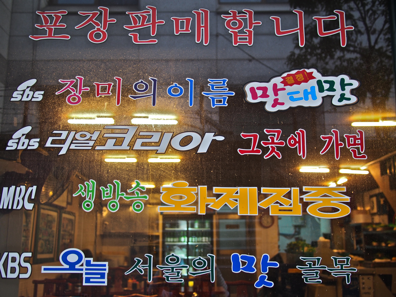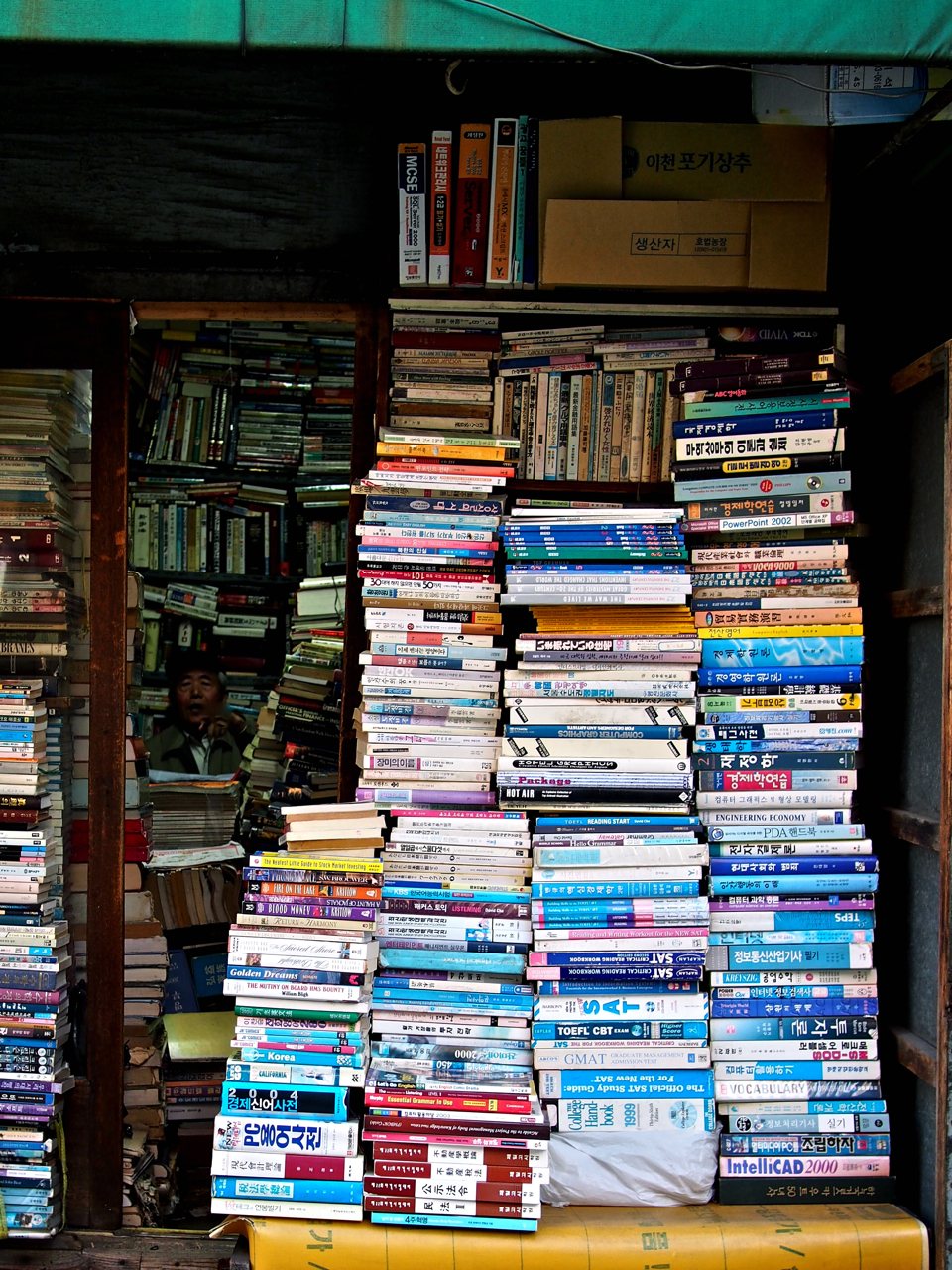 When you step into the alley the first two places on the right are daegutang restaurants, the wall opposite them plastered with beer and soju posters featuring celebrities in tight dresses holding shot glasses just so. If you continue along the alley, past the daegutang places you’ll find a restaurant specializing in cow head soup (소머리탕), should you feel adventurous. There was also, at the very end of the alley, a tiny used bookshop. The shop was the size of a large closet, and whatever books couldn’t fit on the shelves were simply stacked haphazardly floor to ceiling, in the literal sense of the description. These piles took up virtually all available floor space. The only exceptions were a one square-foot space just inside the entrance from where, presumably, a customer could tell the owner what they were looking for, in the hopes that he, miraculously, both knew where it was and could get to it without causing everything to collapse, and a slightly larger clearing in the back where the proprietor slept in a chair, three-quarters hidden by the wall of books that rose up between the spaces.