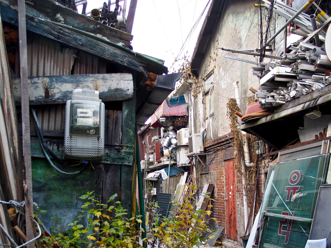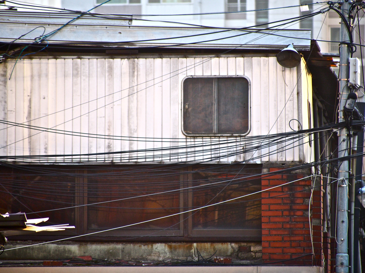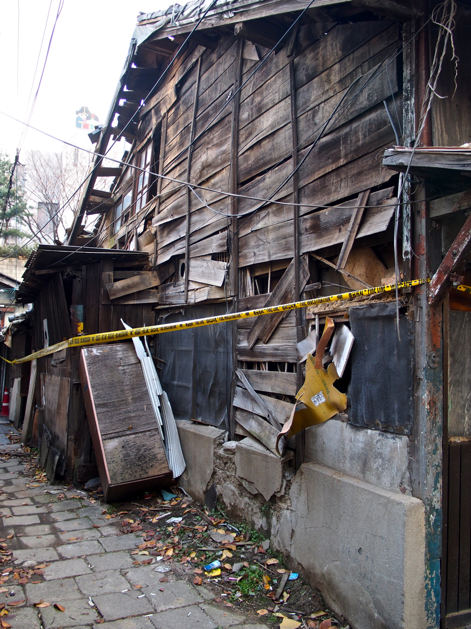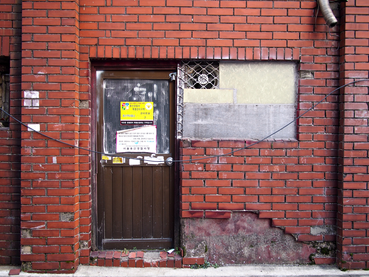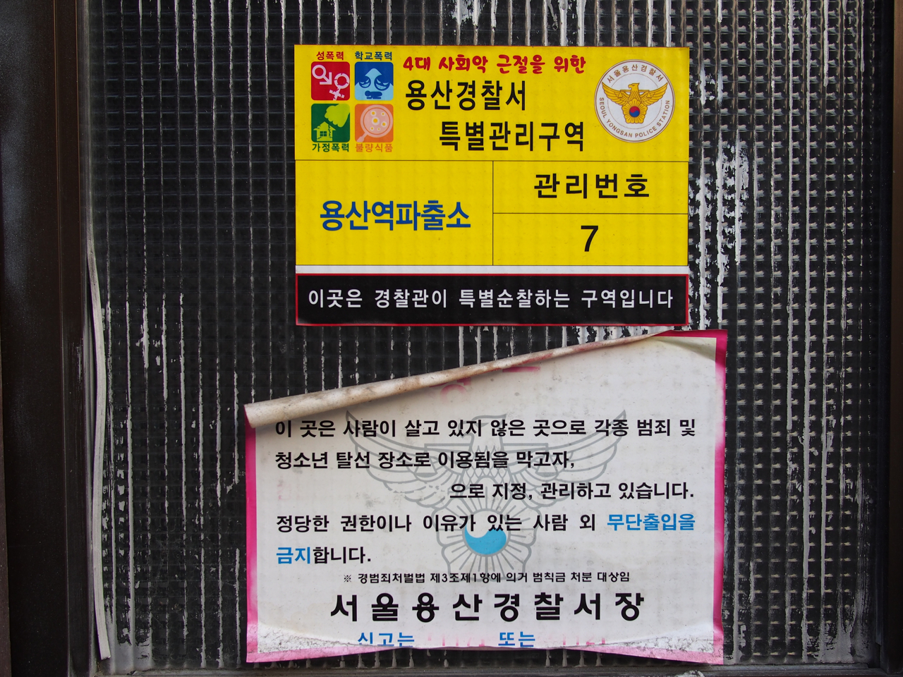 On the west side of Hangang-dae-ro, heading out Exit 8 or 9 will shortly bring you to the rail tracks that run between Yongsan and Yeongdeungpo Stations. I climbed the stairs up to a pedestrian walkway that ran along a road over the tracks and watched for a bit as KTX and Saemaeul trains rumbled by underneath. On the opposite side new apartment towers lined up, but below me the area next to the tracks was occupied by tin roofed machine shops. Just north of these were the recently built Worldmark Apartments, mirroring those across the way, but to the south was an area of small alleys where trash was lined up in piles in front of buildings. A bit further in there were rows of abandoned low red brick buildings. At first I thought they maybe once housed factories, but peering in through broken windows at refuse piled up in former kitchens it appeared that they had previously been apartments. In any case they weren’t anything anymore, and the only sign that anyone still paid them any attention were the signs notifying citizens that the police regularly patrolled the area to prevent crime.