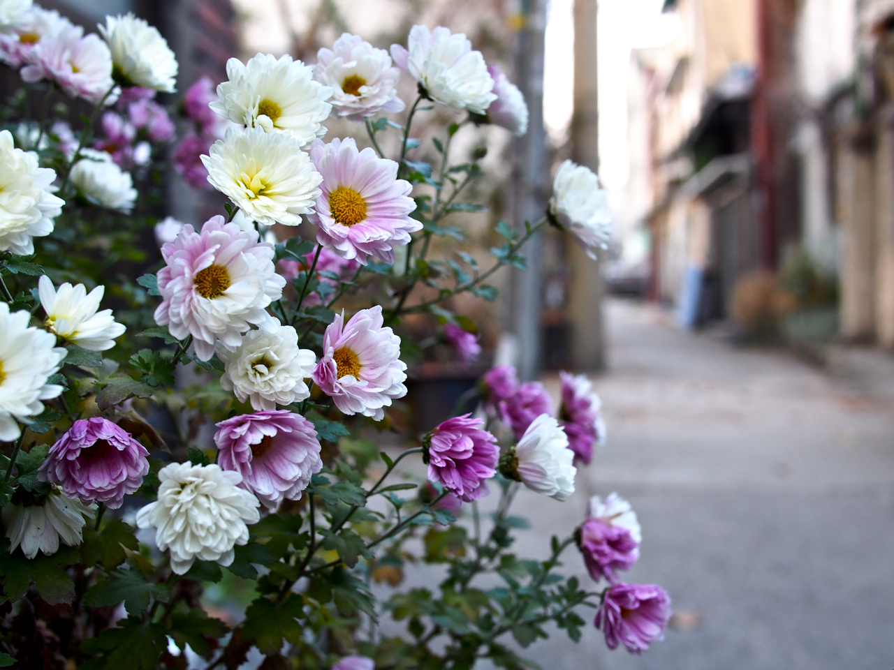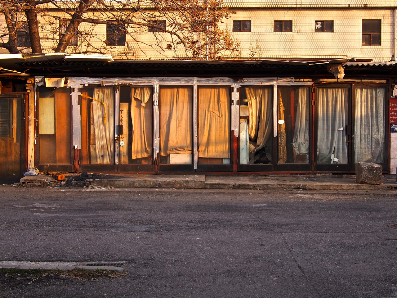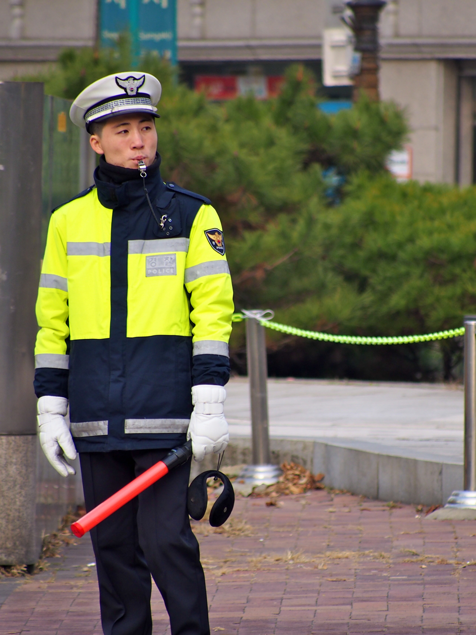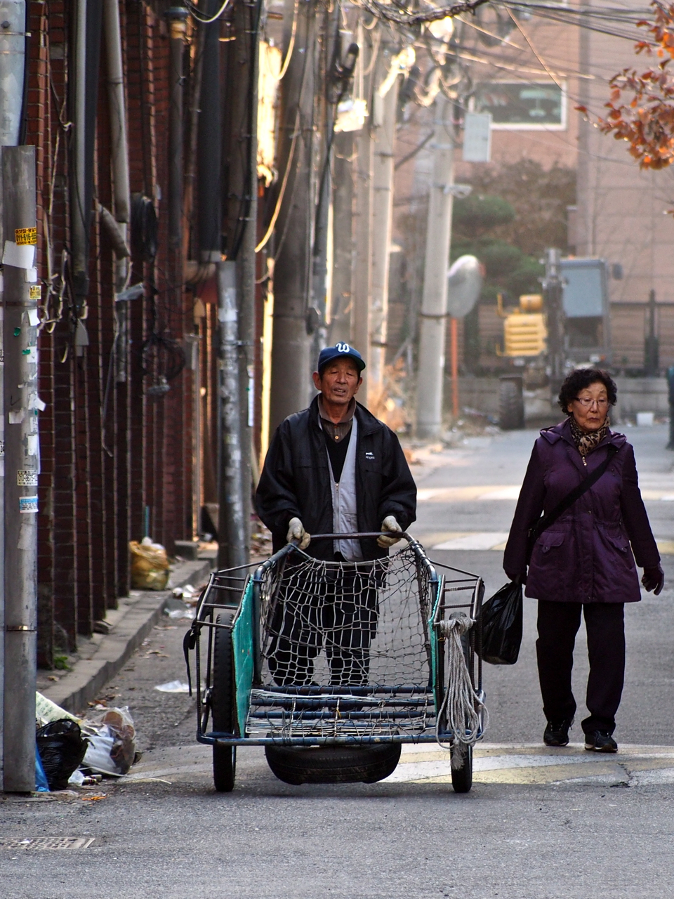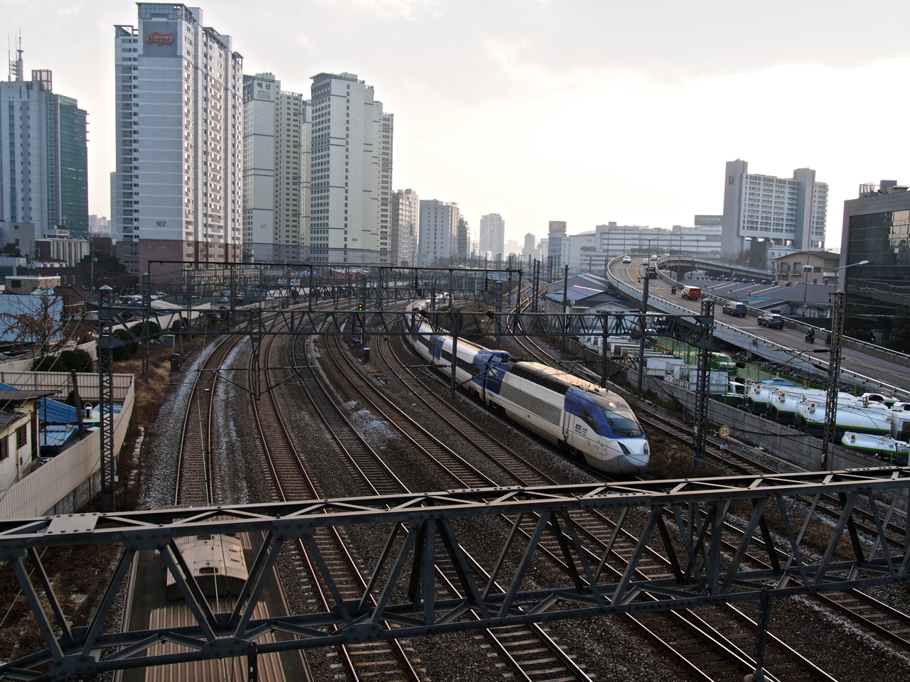 On the west side of Hangang-dae-ro, heading out Exit 8 or 9 will shortly bring you to the rail tracks that run between Yongsan and Yeongdeungpo Stations. I climbed the stairs up to a pedestrian walkway that ran along a road over the tracks and watched for a bit as KTX and Saemaeul trains rumbled by underneath. On the opposite side new apartment towers lined up, but below me the area next to the tracks was occupied by tin roofed machine shops. Just north of these were the recently built Worldmark Apartments, mirroring those across the way, but to the south was an area of small alleys where trash was lined up in piles in front of buildings. A bit further in there were rows of abandoned low red brick buildings. At first I thought they maybe once housed factories, but peering in through broken windows at refuse piled up in former kitchens it appeared that they had previously been apartments. In any case they weren’t anything anymore, and the only sign that anyone still paid them any attention were the signs notifying citizens that the police regularly patrolled the area to prevent crime.