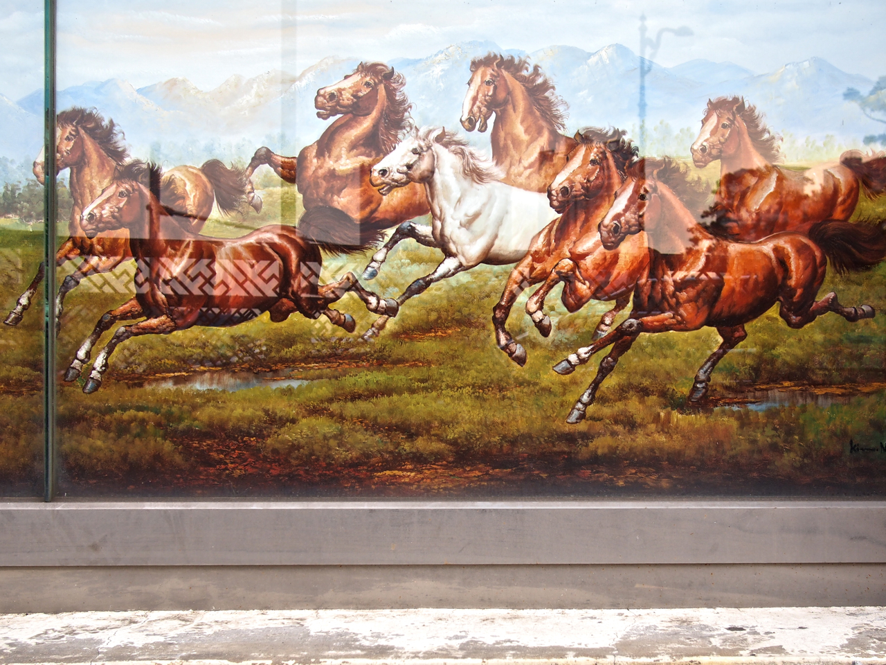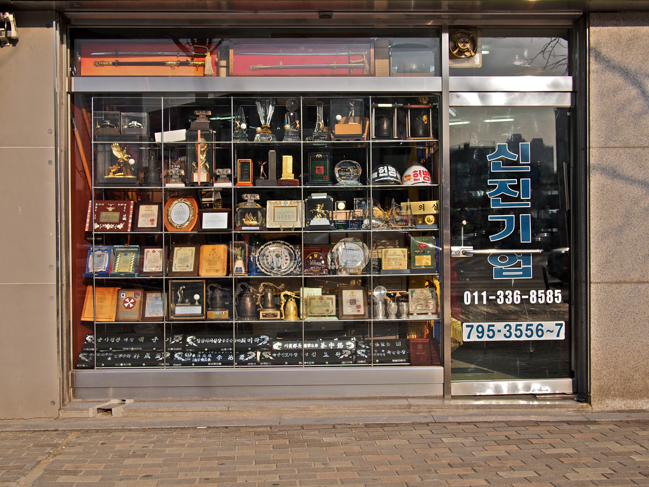 The elevated rotary is long gone, but a spin around the current intersection gives a good overview of the area. There are new mixed commercial-residential towers reflecting recent development in the Yongsan area; old buildings that look like they’ve been around since before the war; stores selling company badges, camouflage jackets, and other military paraphernalia; and party supply stores selling Halloween costumes and real estate offices with plenty of English signage, a sign of this part of town’s significant expat presence. Unexpectedly there are also a lot of art stores, kind of on the chintzy side, almost all of which seem to have a predilection for paintings of galloping horses. Just how this last piece fit into Samgakji’s puzzle I’m not sure.