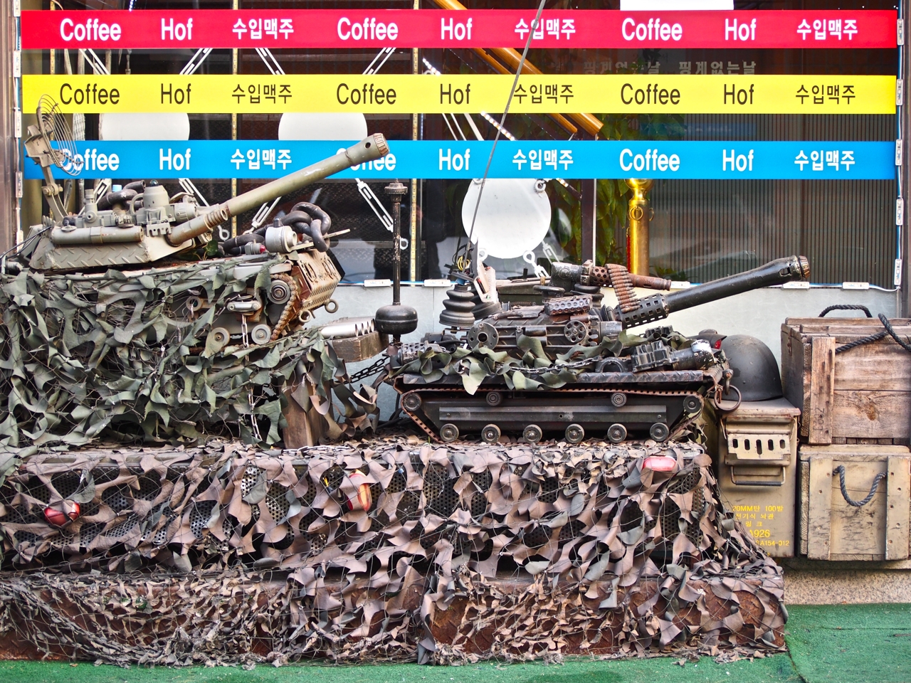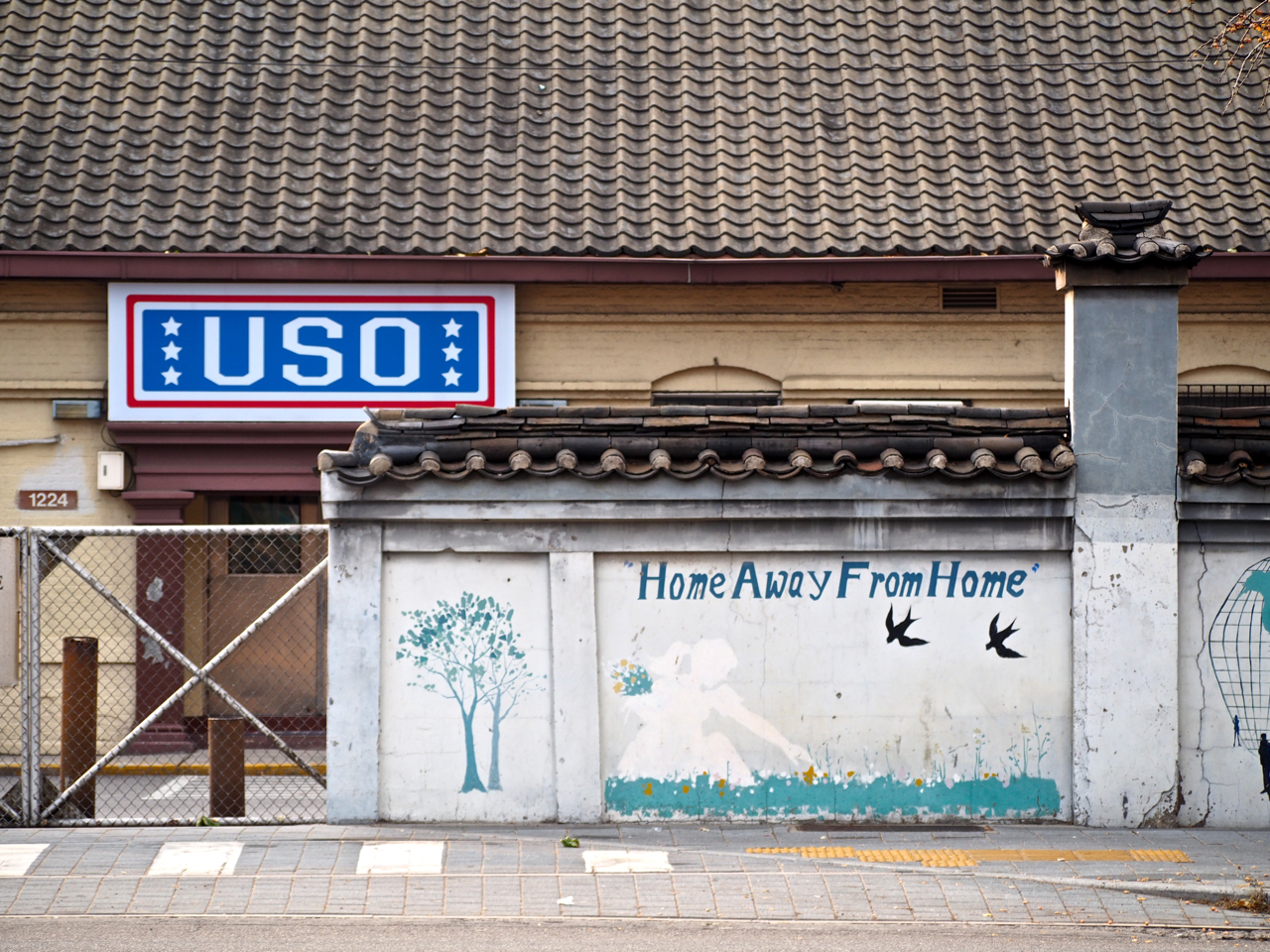 North of the station there’s precious little room to maneuver between the train tracks to the west and the military base to the east. Out of Exit 10, on the west side of Hangang-dae-ro, once you pass the Worldmark you quickly hit walled-off U.S. Army property, before eventually arriving at the USO Office, where a mural in front of the building features mountains, a sun, and some black birds, a few errant splashes of black paint looking as if someone had taken a shotgun to some of the latter. For civilians, the USO is of some interest as it runs popular tours to the DMZ and Panmunjeom, providing visitors with access to several sites other tours aren’t allowed to go, thanks to its military affiliation.