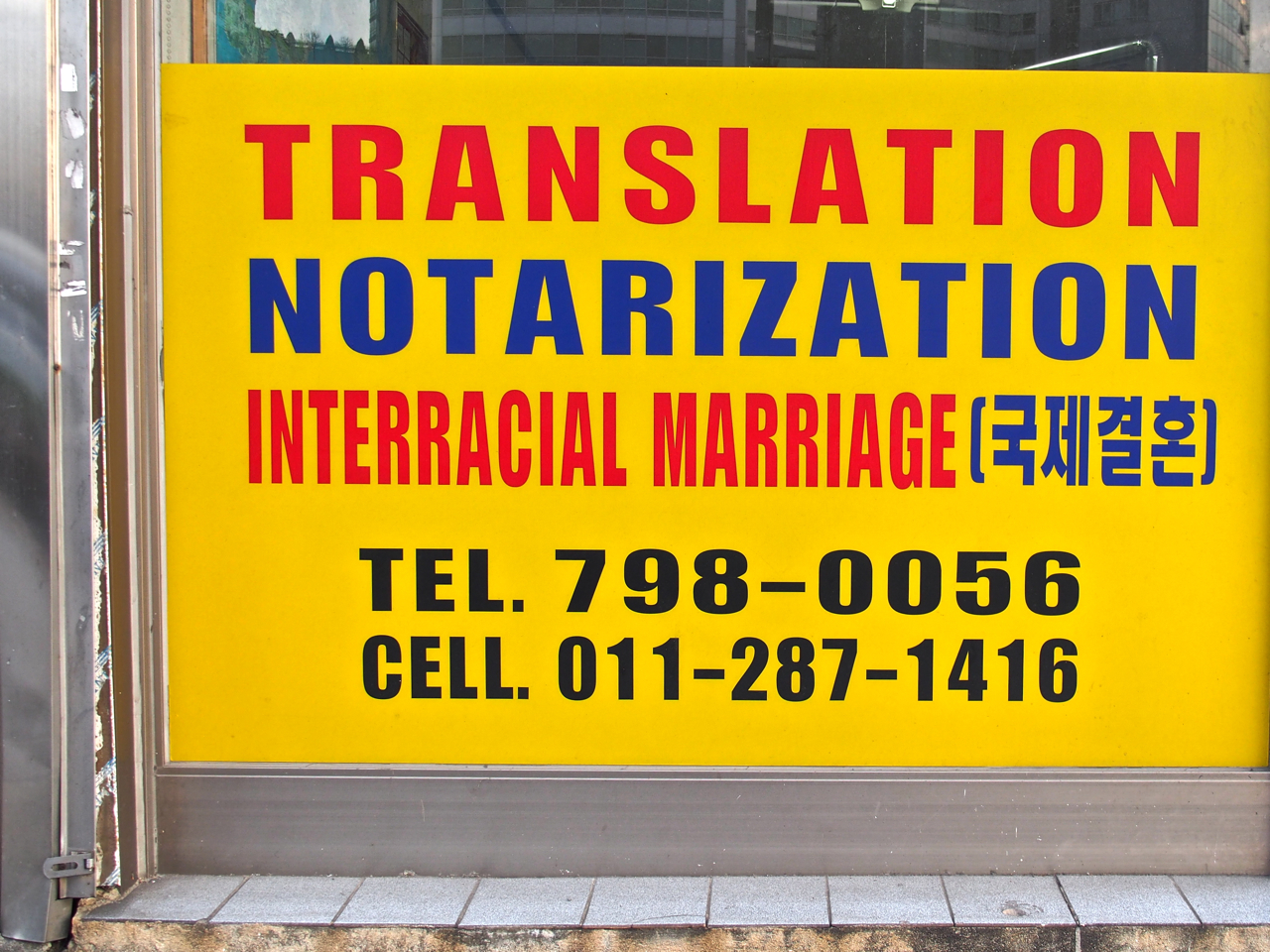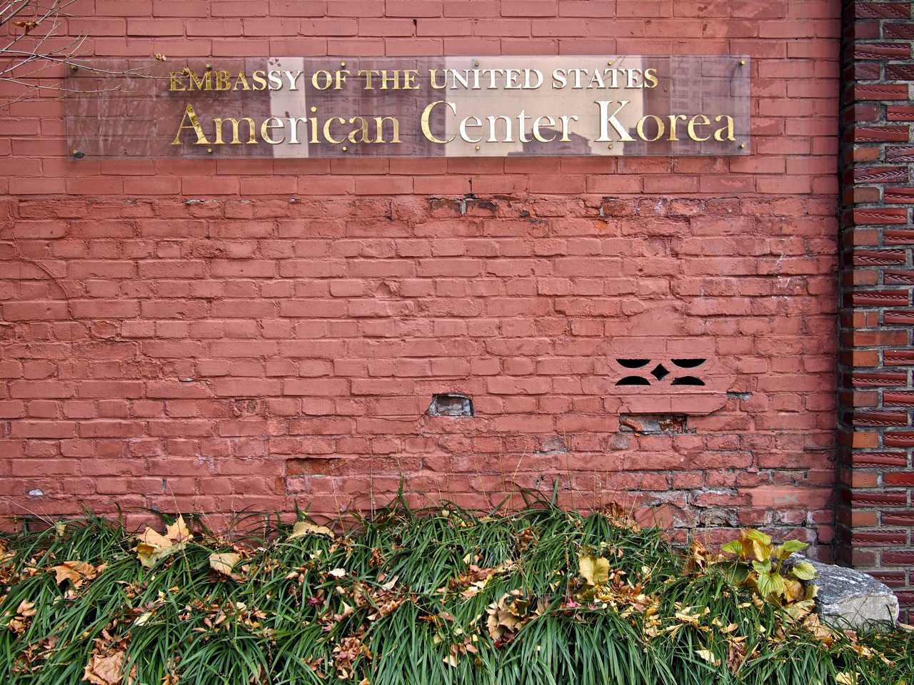 On the other side of the road, Exit 11 eventually leads to another U.S. government institution, the Embassy of the U.S. American Center in Korea, a reference and research center that aims to inform Korean citizens about U.S. policy and society. Before reaching this you’ll pass a number of old buildings squeezed into a quarter-block deep space between the road and the military base, almost every one of which looks like it’d be more at home in a Chungcheon-do village than in central Seoul. There are also a few real estate offices and notary and translation services targeting foreign clients, including one that arranged paperwork for international marriages but had rather hilariously mistranslated its services (국제결혼) as ‘Translation, Notarization, Interracial Marriage.’