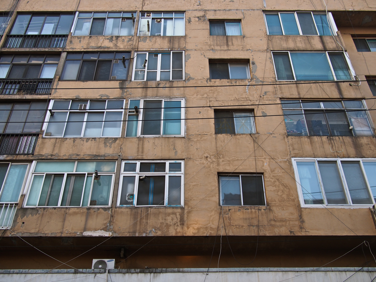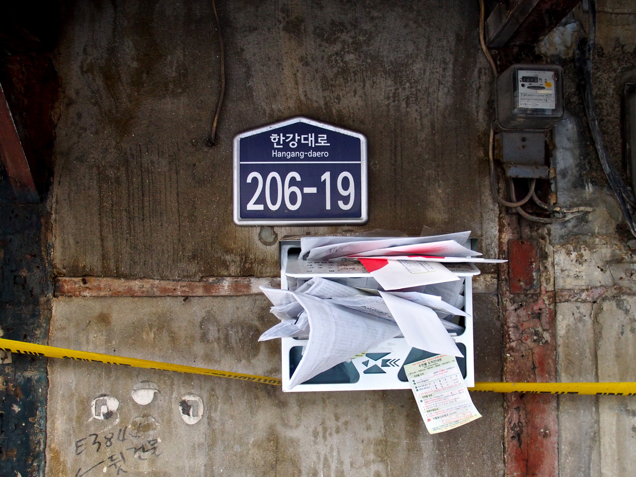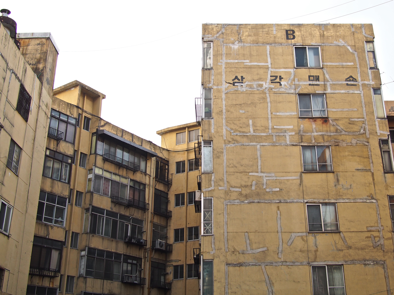 On the same side of the intersection the character of an older Samgakji is apparent along Hangang-dae-ro (한강대로) and, especially, in the alleys off the main street. Out of Exit 14, I took the first left onto the slanting Hangang-dae-ro-62-gil (한강대로62길), which was lined with modest restaurants, grocers, and other small businesses. Some of them looked like they’d been around a while, though none looked quite as antiquated as the large Samgak Mansion (삼각맨숀) apartment complex just off the street to the west. The apartments were marked rather prominently on the station’s area map and may have been an enviable address at one point, but their current ramshackle, patchwork condition reminded me of another mansion, Chungking in Hong Kong, only on a smaller scale. Windows were cracked. The 삼 in 삼각 had disappeared. The apartments were the color of teeth yellowed from decades of cigarettes, the shade disrupted only by torn green awnings above windows and the plaster covering cracks in the façade, giving the appearance that the buildings were being held together by duct tape.