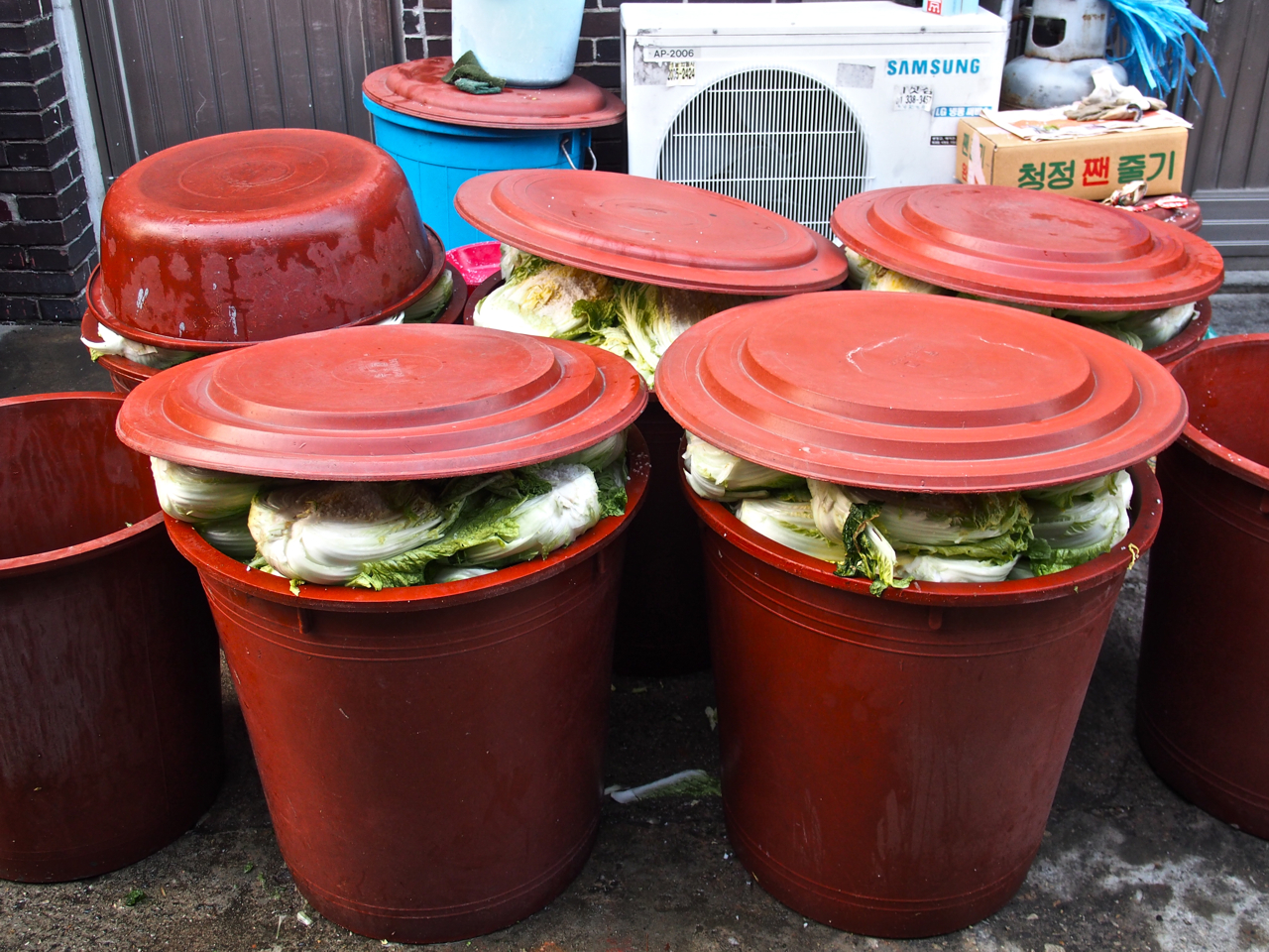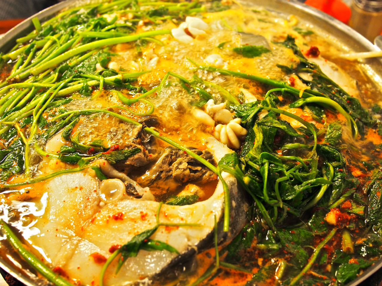 One of the two daegutang restaurants in the alley, Weon Daegutang (원대구탕) is an old-school place that’s been serving its cod soup in an unfussy setting of wood tables and straight-backed chairs for thirty-three years. Water is served in old makkeoli bottles that have had their labels peeled off, and maroon gas pipes run around the edges of the ceiling and lead to ancient-looking gas burners atop each table where pots of soup are cooked once an order is placed. The soup is a spicy concoction of a cod, red pepper paste, garlic, bean sprouts, and dropwort. When I say ‘a cod’ I mean ‘a cod’ and not just ‘cod’ in the sense of ‘cod meat.’ The whole thing goes in: head, intestines, organs, all of it. If that’s not your thing (and not all of it is mine), well, it’s pretty easy to pick out what you want. If that is your thing, you can opt for the naejangtang (내장탕), with extra guts.