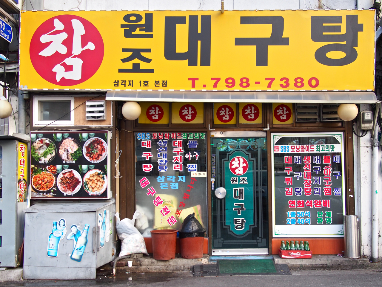 Near the entrance of Hangang-dae-ro-62-gil is a small alley, Hangang-dae-ro-62-ga-gil (한강대로62가길), running parallel to Itaewon-ro (이태원로) and known as Daegutang Alley (대구탕 골목). Seoul is dotted all over with specialty food alleys, sometimes featuring a dozen restaurants serving the featured dish; Daegutang Alley has two, but there’s one more daegutang place on the main side street and the alley is so short that the two places fill up half the lane so, OK, we’ll run with it.