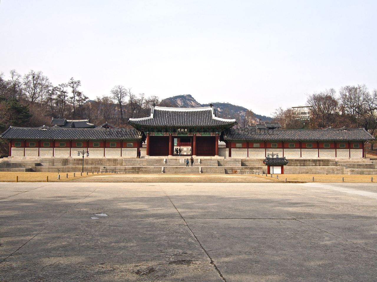 Gyeonghuigung was constructed from 1617 to 1623 as something of a royal villa, the other other palace the emperors could go to. The inner gate opens onto a stone courtyard bordered by covered walkways and backed by Sungjeong Hall (숭정전), the grooves in its black roof tiles filled with snow and giving the appearance of piano keys. Sungjeong was the palace’s main hall, where kings met with subjects, arranged official ceremonies, and entertained foreign emissaries. Three kings were also inaugurated here, and the interior contains a model of the imperial throne, fronted by rows of cushions for the dignitaries and courtiers who awaited the king’s orders. The current hall is a recreation; the original was sold to the Japanese temple Jogyesa before eventually being moved Dongguk University’s campus, where it stands today.