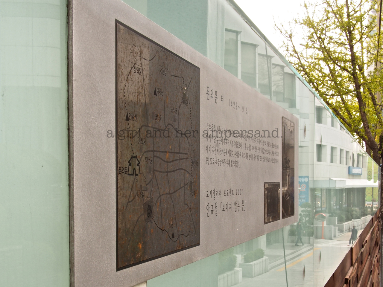 Picking up the history thread again, I returned to Exit 4 and the Former Site of Donuimun, but this time, instead of continuing straight, I turned left on Songweol-gil (송월길) to follow what the sign on the corner says is the 7th Alley Walking Course in Gyonam-dong (동네골목길관광제7코스 | 교남동).