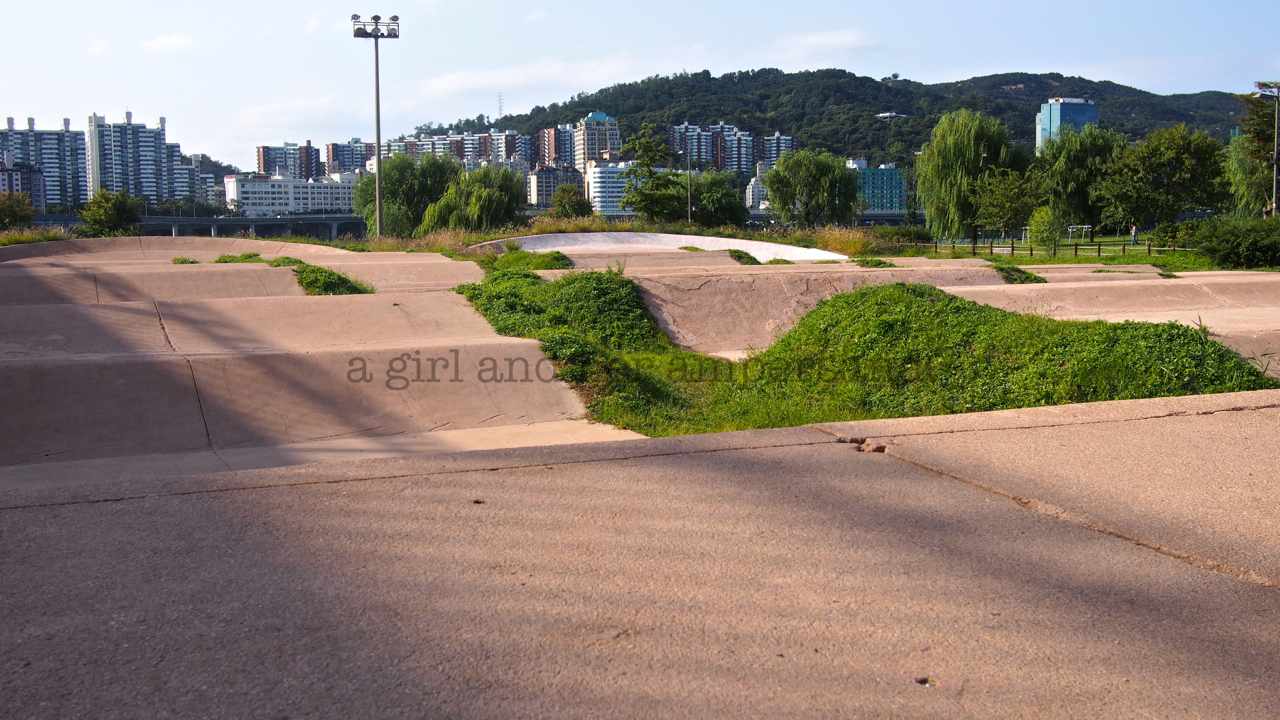 Tucked between the shadows of the Cheonho (천호대교) and Gwangjin Bridges (광진교), the first facility I came to was the Racing Stadium (레이싱경기장), by which Koreans mean a BMX track. The fact that it was pavement and not dirt didn’t seem to matter to the dozen or so middle school-age kids pedaling up and down the ramps and around the banked U-turns before zipping back around to the start to go again. On the west side of the Cheonho Bridge was an inline skating track, where kids who knew what was up were running circles around those who were out learning with parents or older siblings, and, complementing the BMX track, the X-Games Park (X게임장) (Korean-speak for ‘skate park’), where young inline skaters and skateboarders practiced jumps and flips on the ramps and rails. Just past these was the Rail Bike Zone, where families and couples pedaled big red and yellow carts around iron rails that wound between reeds and small trees.