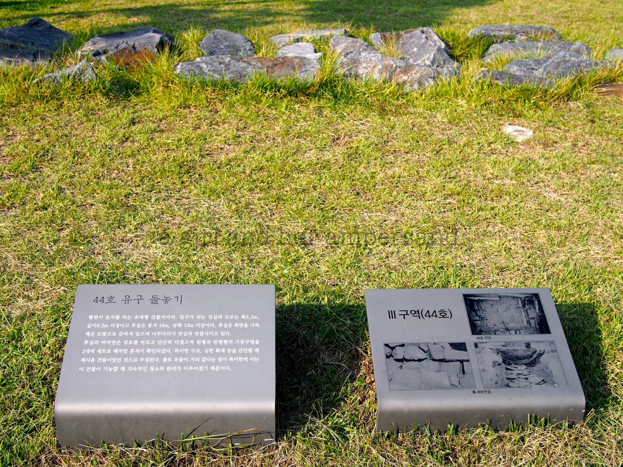 Though the occasional green tarp at the structure’s crest hints at these excavations, this section of Pungnaptoseong is not, for the time being at least, a place where you can get a look at the archaeological work that’s been done. For a glimpse of that, instead head out Exit 9 and walk down Olympic-ro (올림픽로) to Olympic-ro-59-gil (올림픽로59길). Take a right there, swing left on Punseong-ro-25-gil (푼성로25길), and then an immediate right onto Punseong-ro-25-na-gil (푼성로25나길). On your left, looking a bit like an unused lot, is another section of Pungnaptoseong, but one more block ahead is Pungnaptoseong Gyeongdangjigu (풍납노성 경당지구), a one-block park built on a former excavation site. On-site information stated that two recent digs were carried out there. The first, performed in 1999-2000 by a team from the Hanshin University Museum, unearthed thousands of pieces of earthenware and roof tiles. In 2008 a second excavation uncovered storage facilities, a well, Chinese porcelain, and earthenware from Japan, leading researchers to conclude that the site was home to the upper-class and possibly to royalty. Now, in addition to the exercise equipment and the wildflower beds, four separate areas of the park are marked as former dig sites, each with a small plaque and photos providing insight into what came out of the earth in that spot (Korean only).